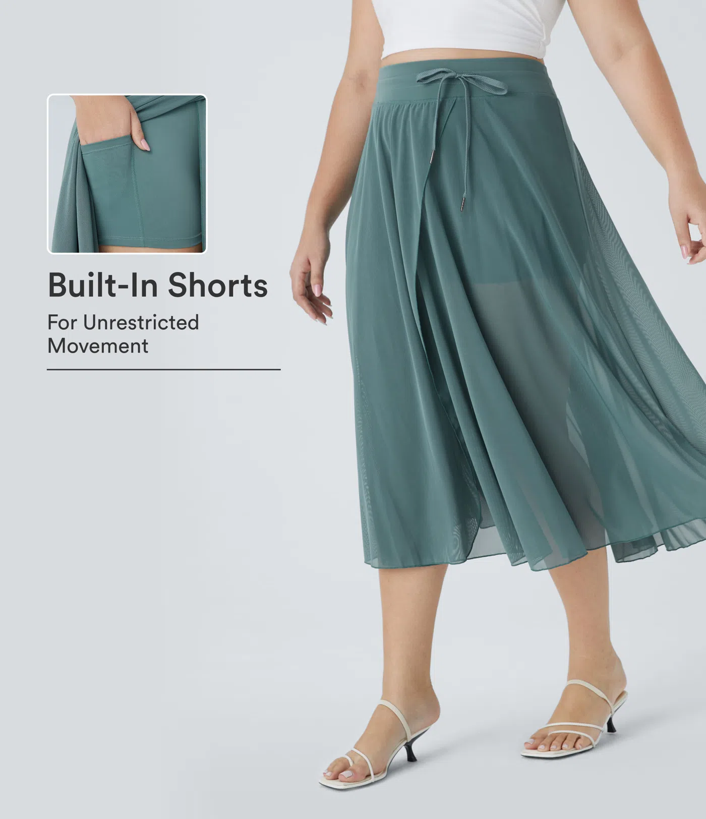 $34.95$49.95High Waisted Drawstring Contrast Mesh 2-in-1 Pocket Flowy Midi Flare Casual Plus Size Skirt