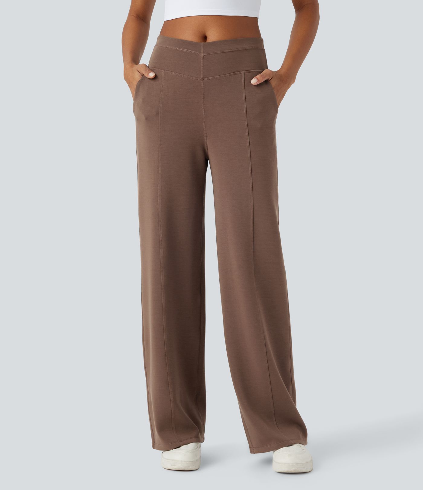 High Waisted V Shaped Pocket Wide Leg Casual Pants