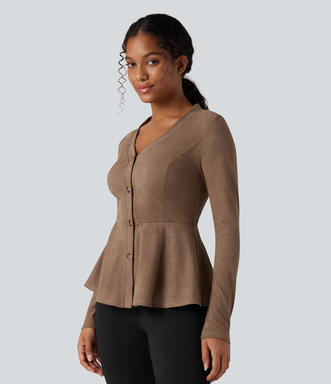 V-neck Long Sleeve Ruffle Hem Casual Suede Jacket