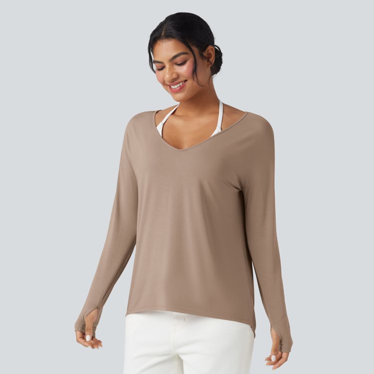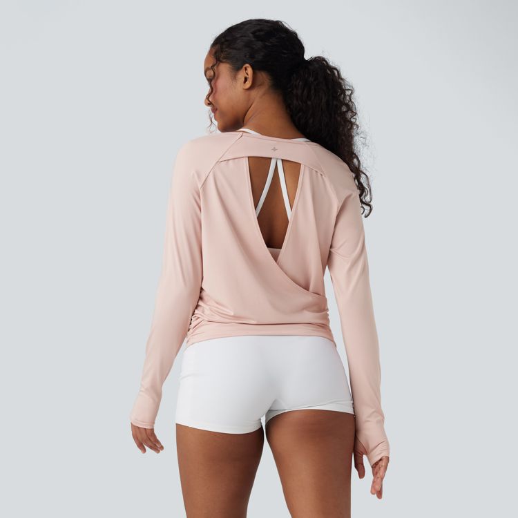 Long Sleeve Thumb Holes Crossover Tie Back Sheer Mesh Dance Sports Top