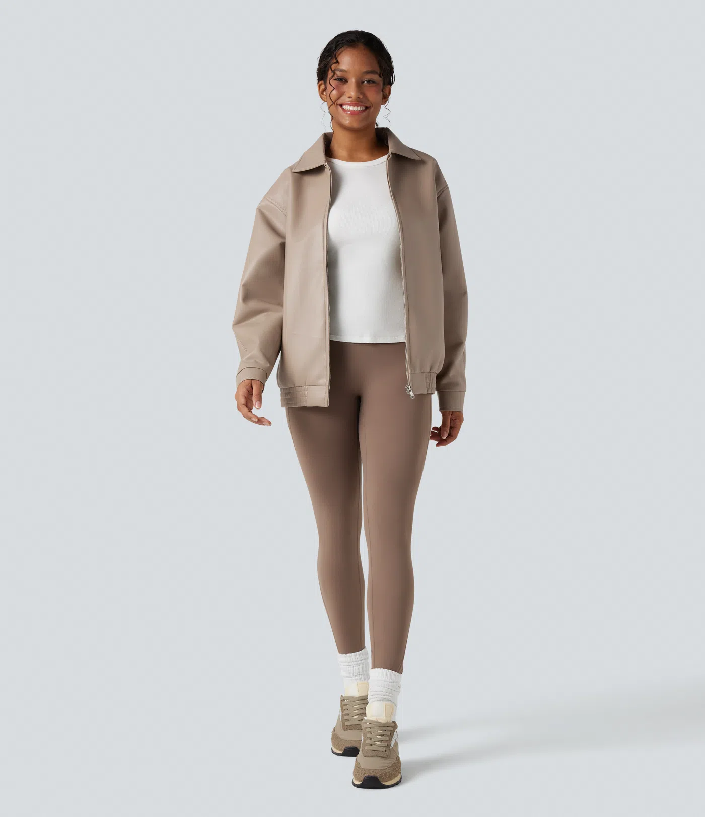 Round Neck Long Sleeve Zipper Casual Faux Leather Jacket with Pockets