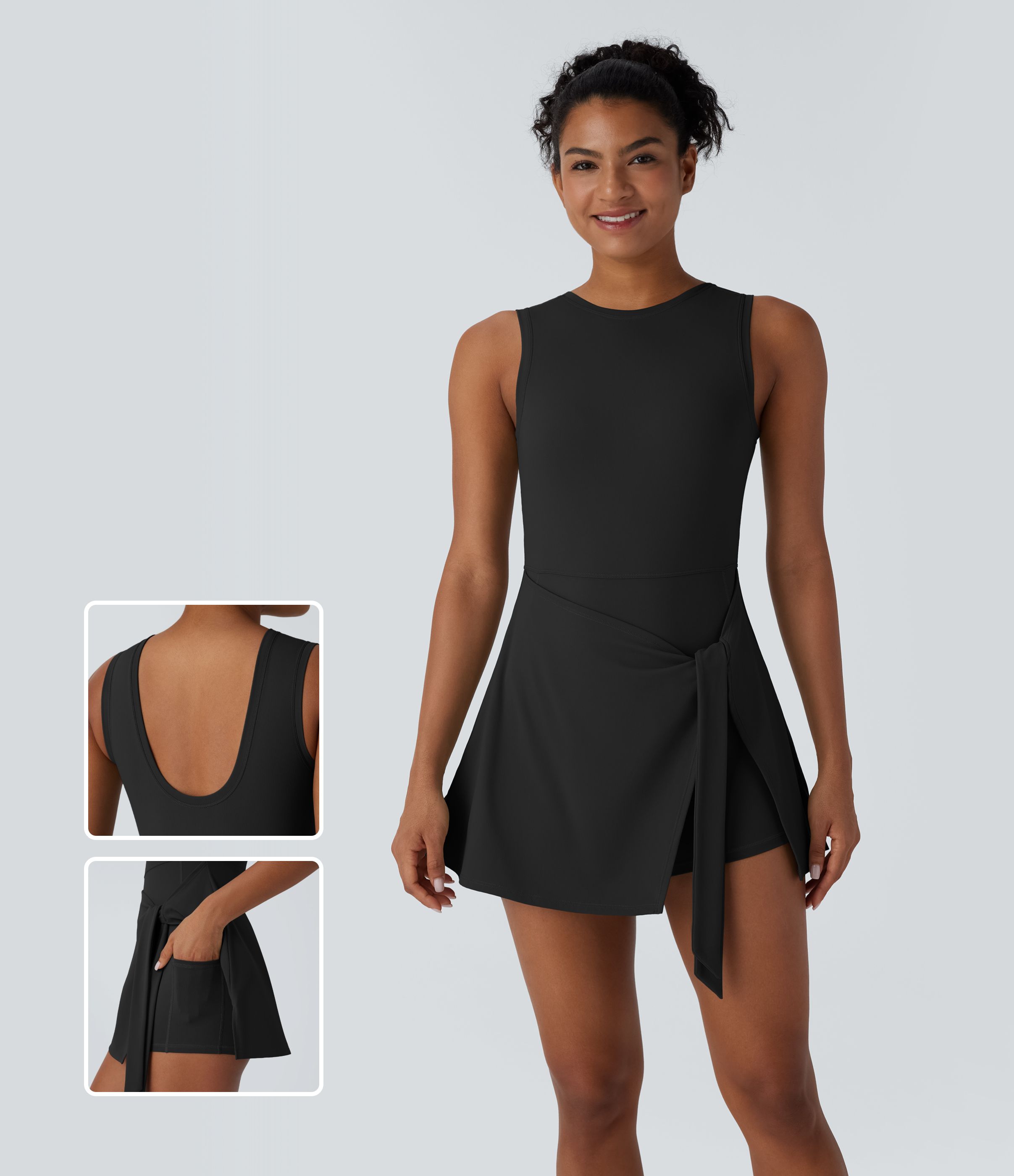 Vestido Activo Micro Mini Pickleball Sin Mangas con Lazo Envolvente Frontal de 2 en 1 con Bolsillo