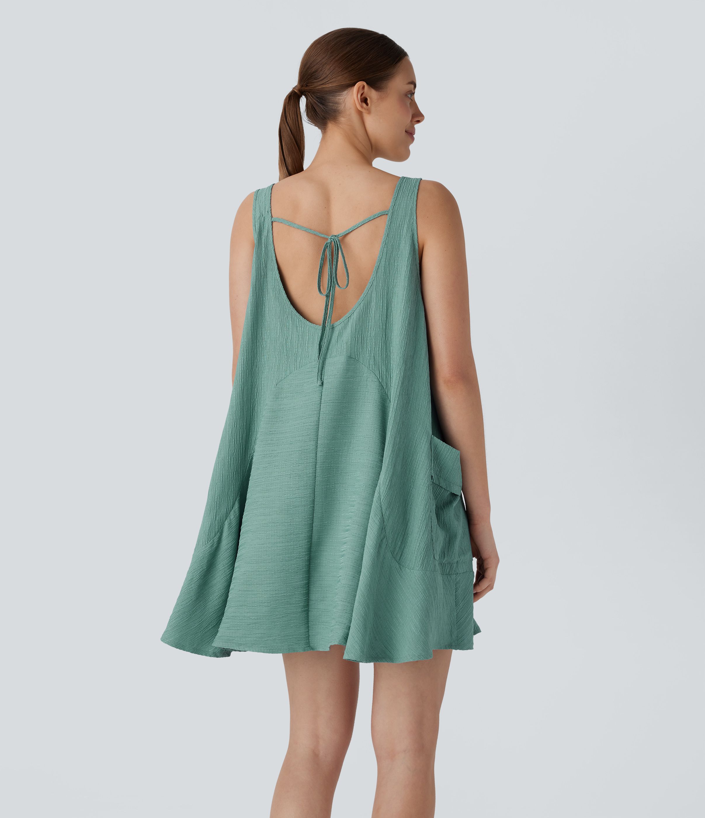 Tie Back Sleeveless Flowy Mini Casual Tunic Dress with Pockets