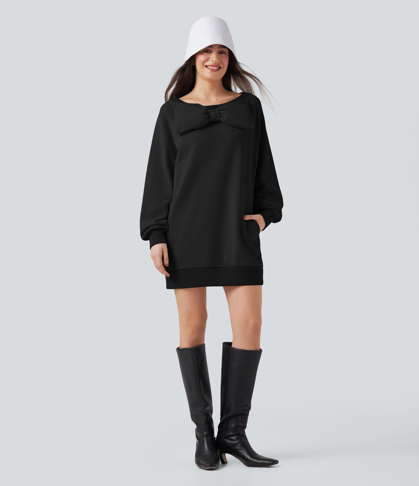 Bow Boat Neck Long Sleeve Casual Cotton Sweatshirt with Pockets