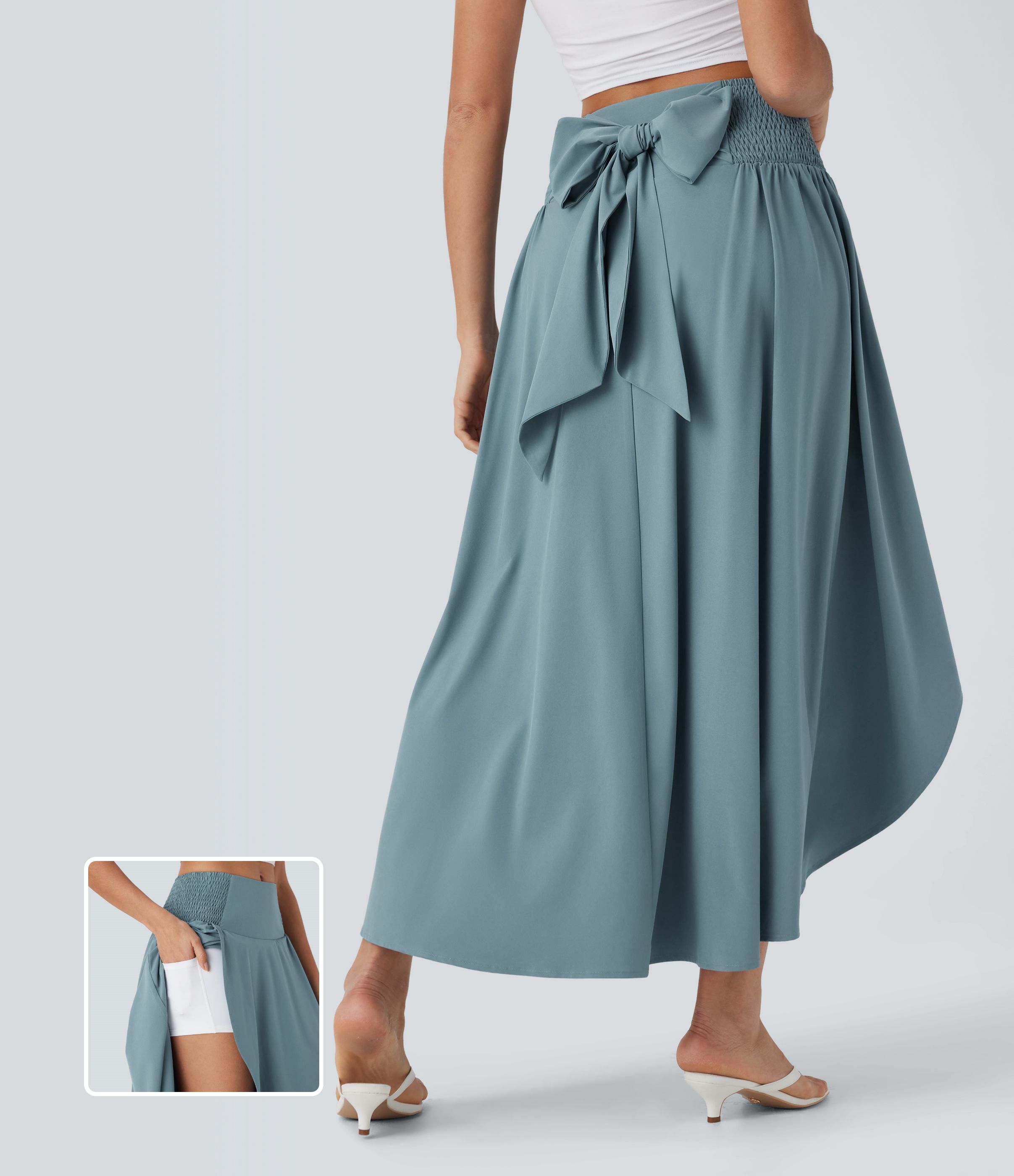 Breezeful™ High Waisted Shirred Tie Back Crossover 2-in-1 Flowy Quick Dry Casual Skirt with Pockets