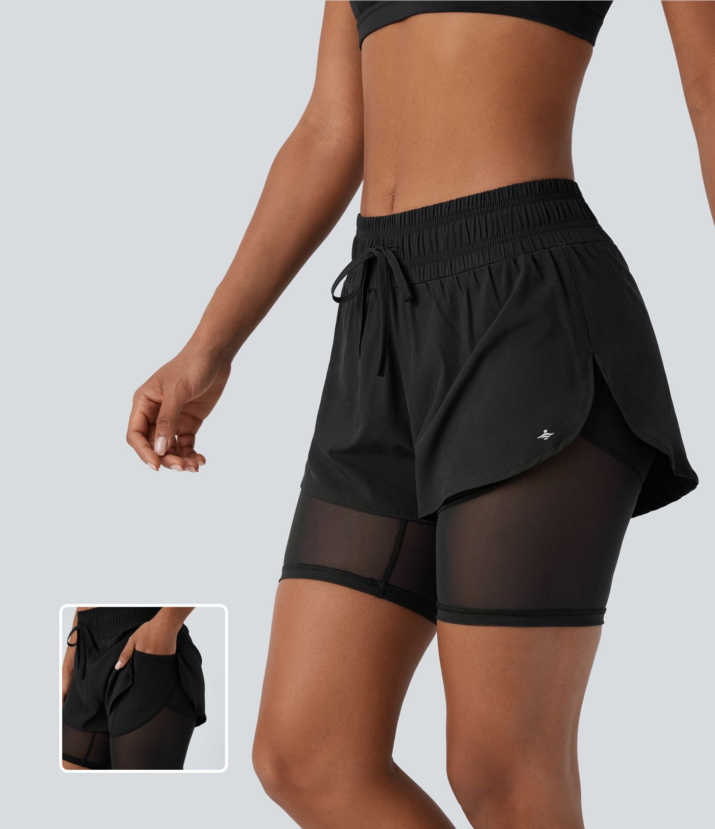 Breezeful™ Mid Rise Drawstring Contrast Mesh 2-in-1 Pocket Quick Dry Running Shorts