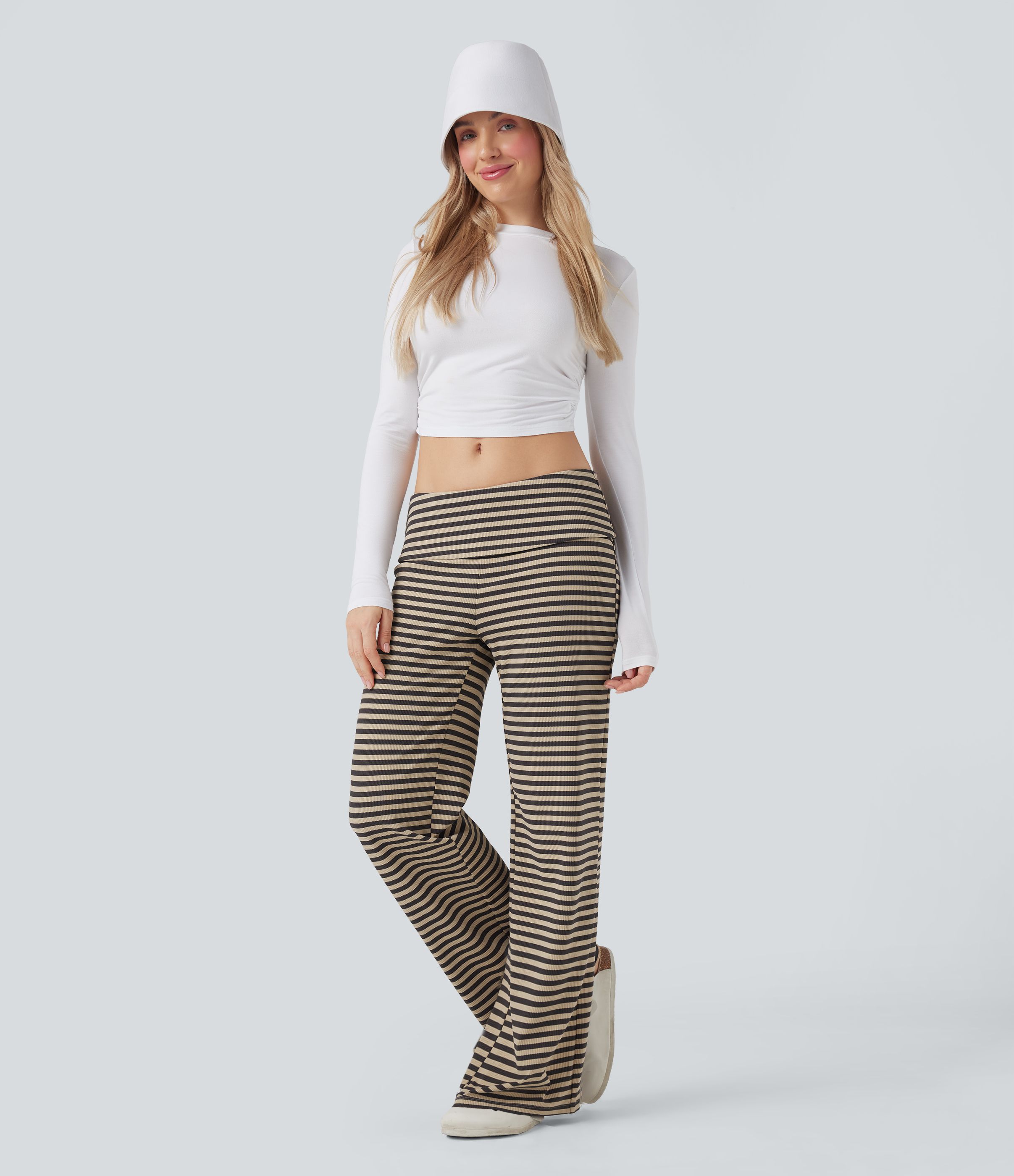 Pantalones acampanados informales de talle bajo, a rayas y con cintura doblada