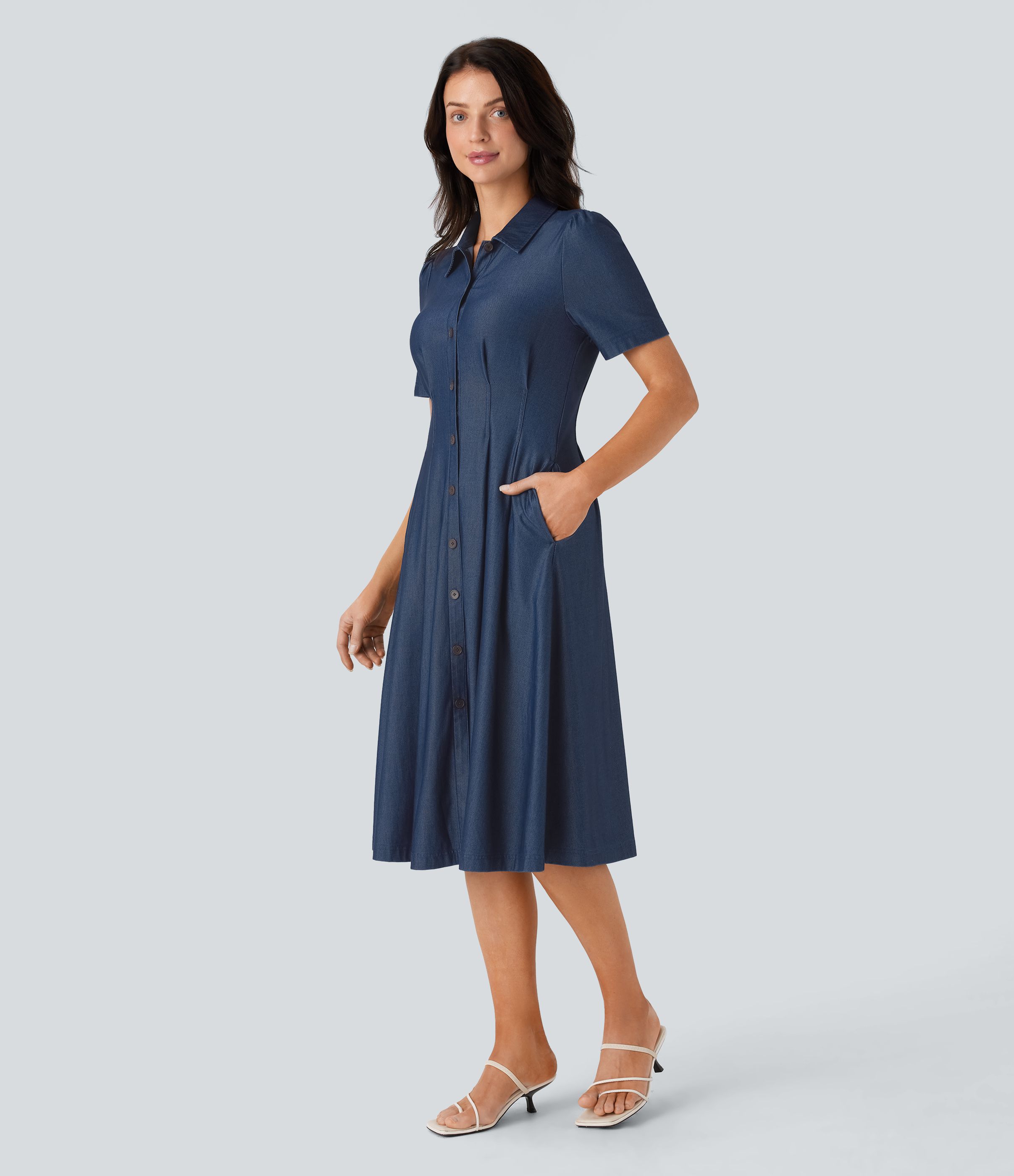 Halara Flex™ Short Sleeve Pocket Denim Flare Midi Casual Dress