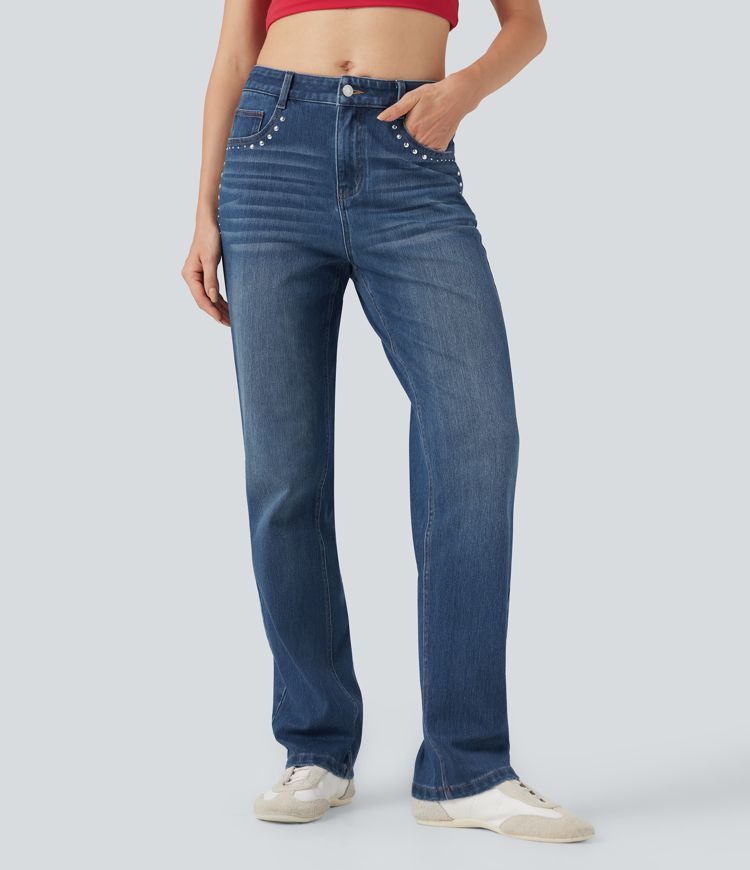 Halara Flex™ Mid Rise Studded Straight Leg Casual Jeans with Pockets