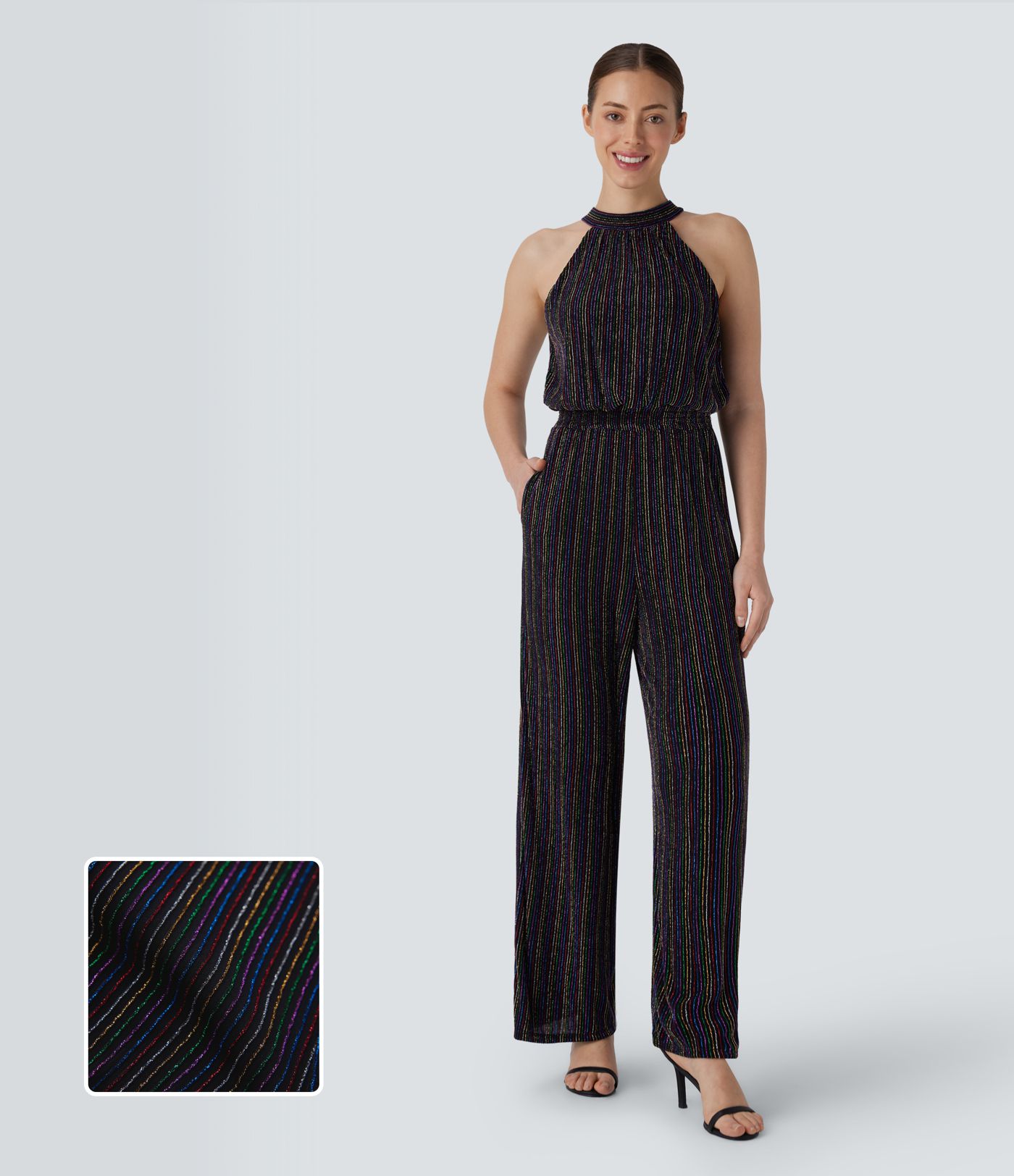 Halter Tie Back Sleeveless Pocket Metallic Stripe Casual Jumpsuit