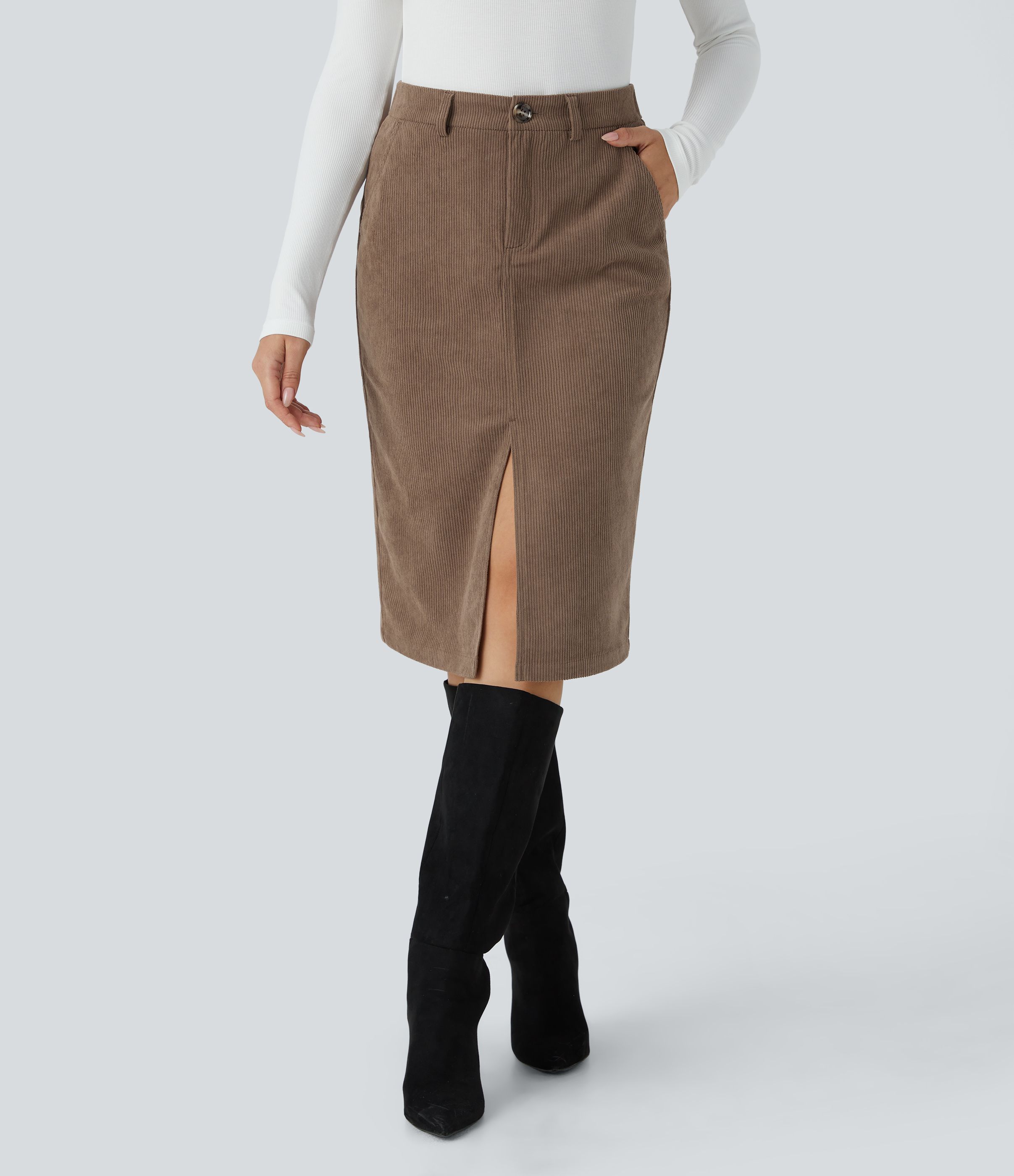 High Waisted Zipper Pockets Midi Corduroy Work Skirt