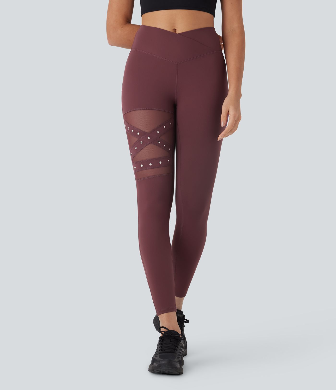 DayStretch High Waisted Crossover Contrast Mesh Studded Yoga Leggings with Pocket