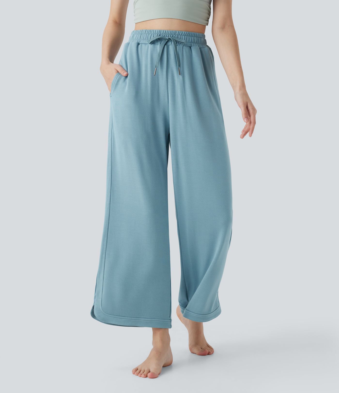 High Waisted Drawstring Curved Hem Straight Leg Yoga Pants with Pockets