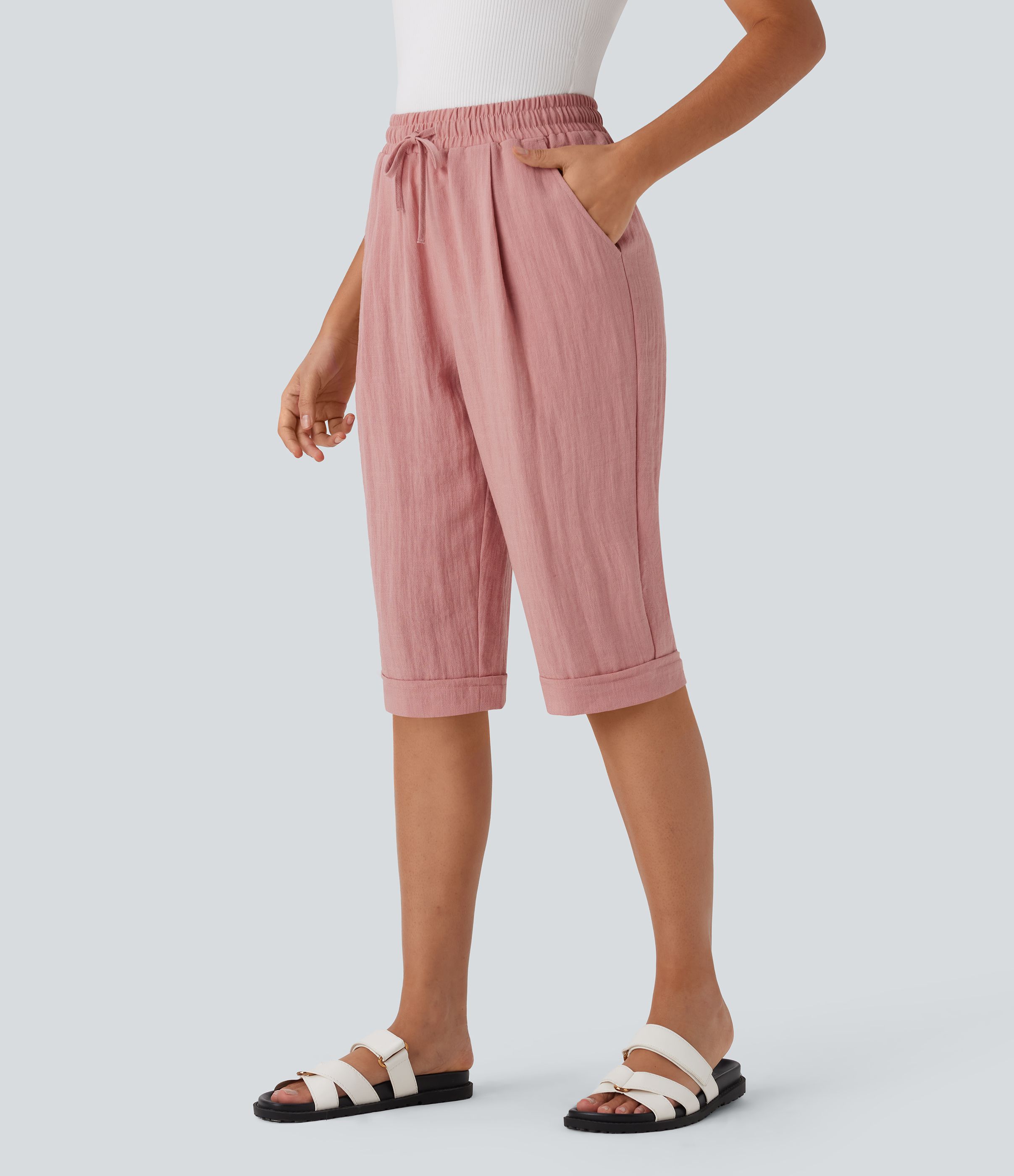 Pantalon Casual en Lin avec Taille Haute, Cordon de Serrage et Poches, Coupe Corsaire