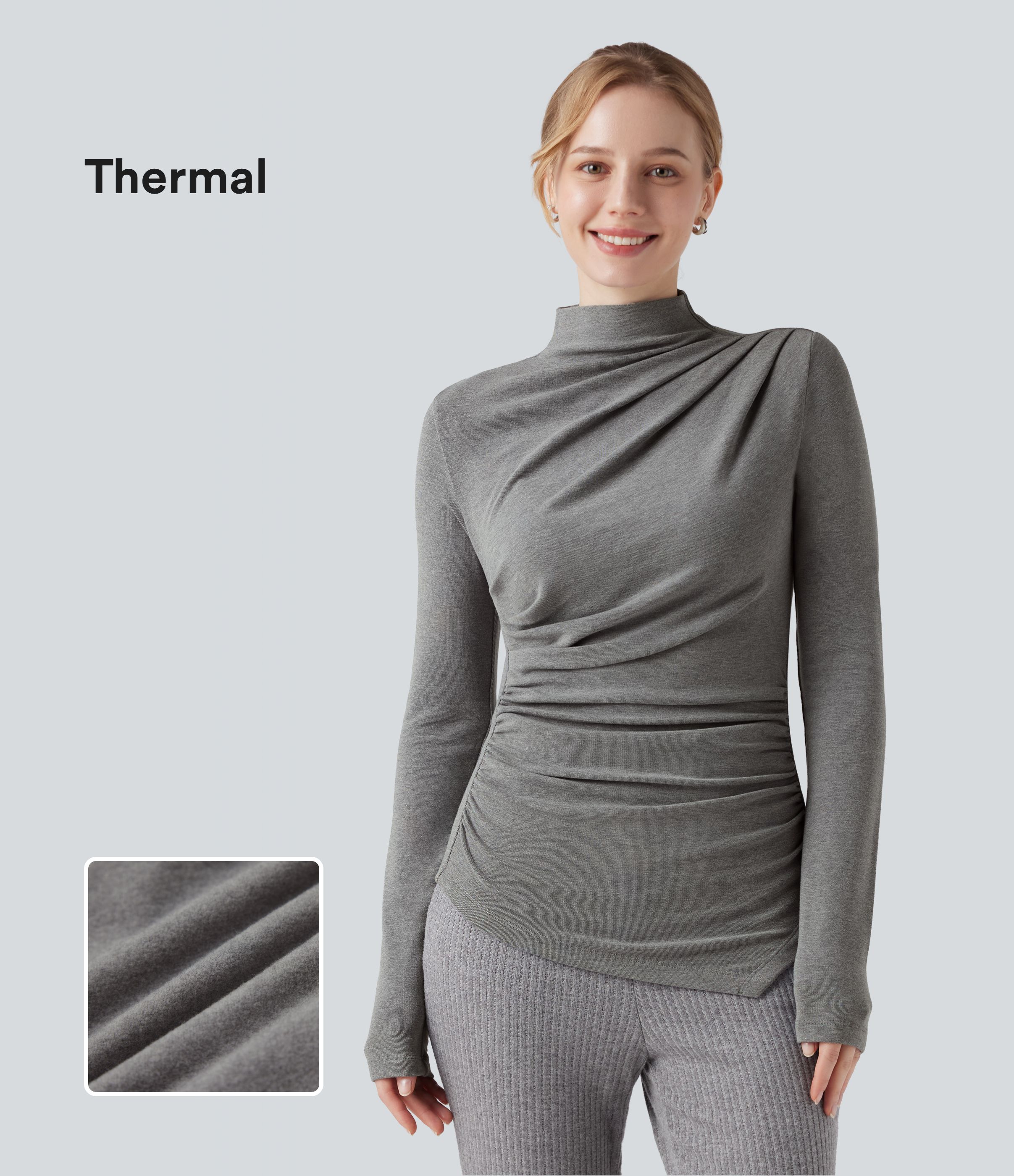 Top Thermique Décontracté à Col Haut, Manches Longues, Froncé avec Ourlet Asymétrique