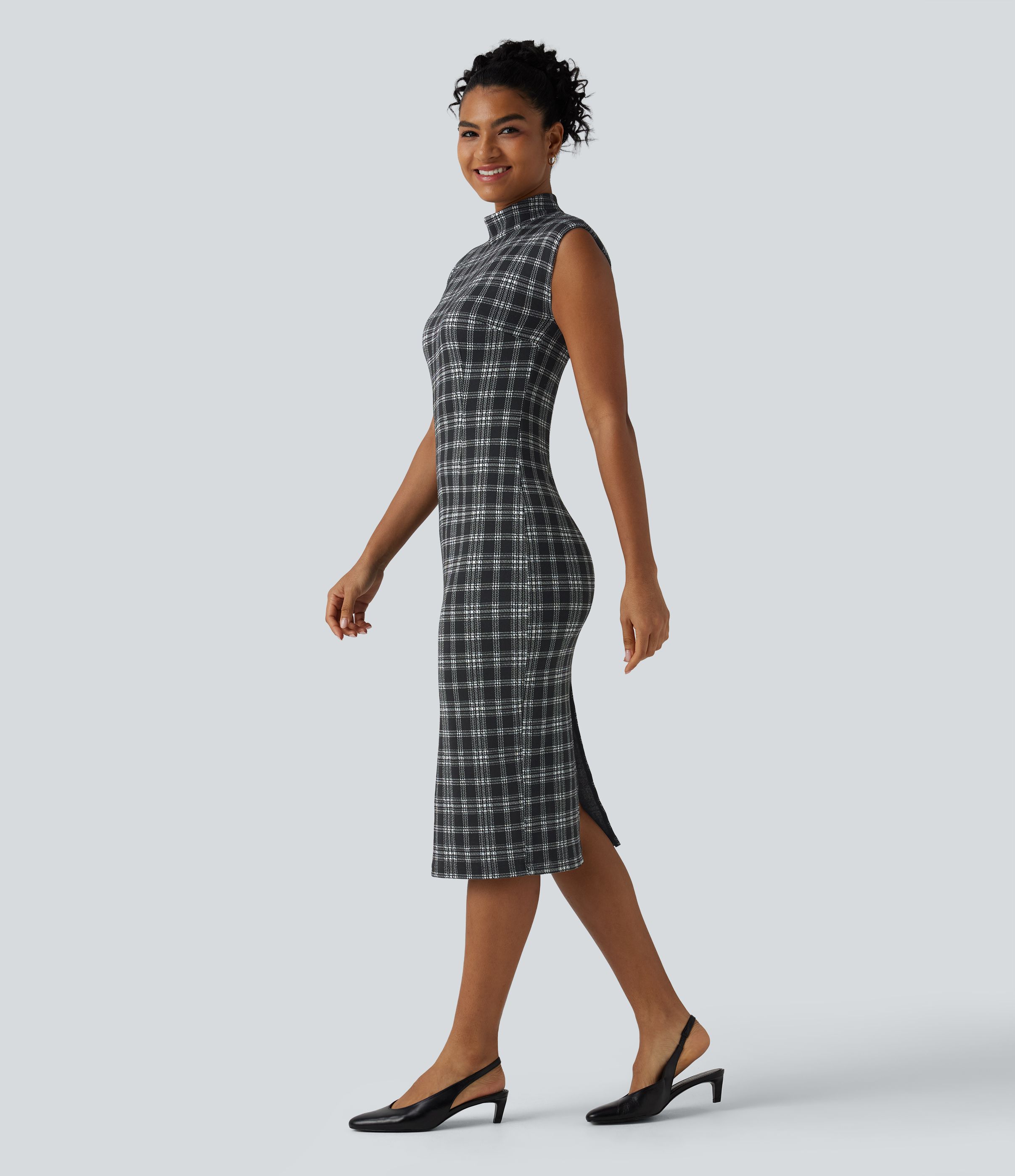 High Neck Sleeveless Bodycon Houndstooth Plaid Midi Work Dress