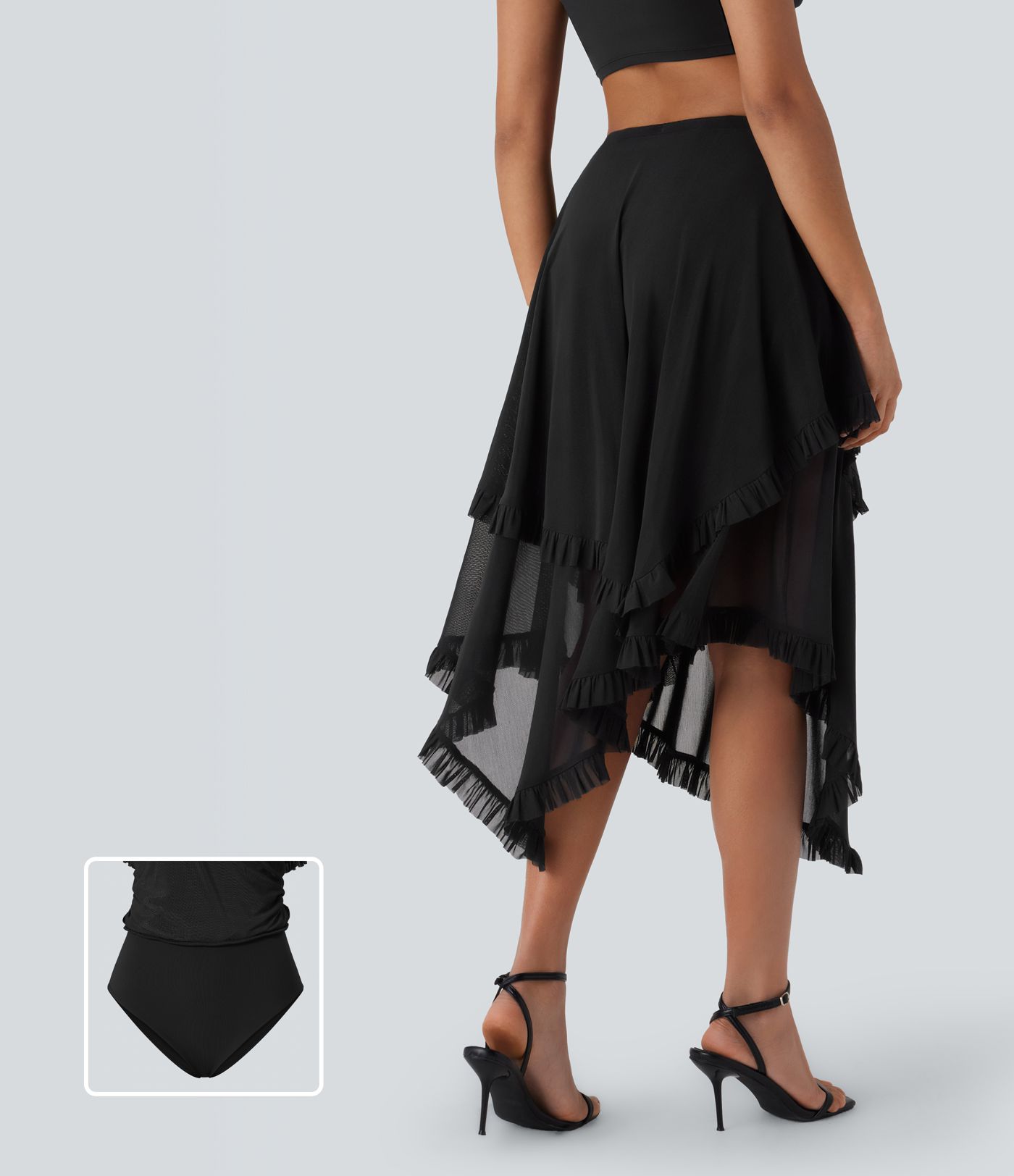 Mesh Mid Rise Drawstring Frill Asymmetric Hem 2-in-1 Flowy Skirt