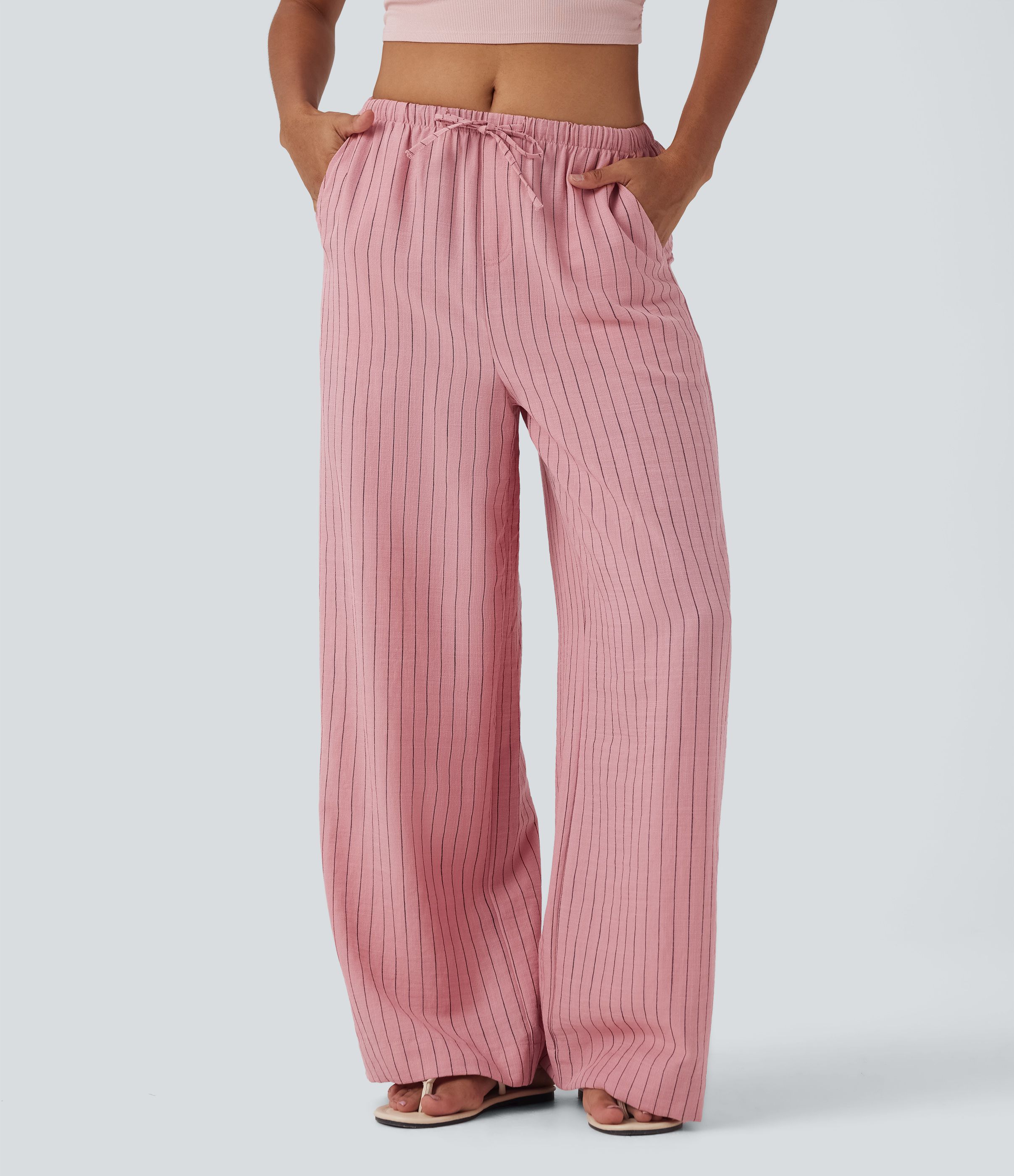 Mid Rise Drawstring Stripe Wide Leg Casual Linen-Feel Pants with Pockets