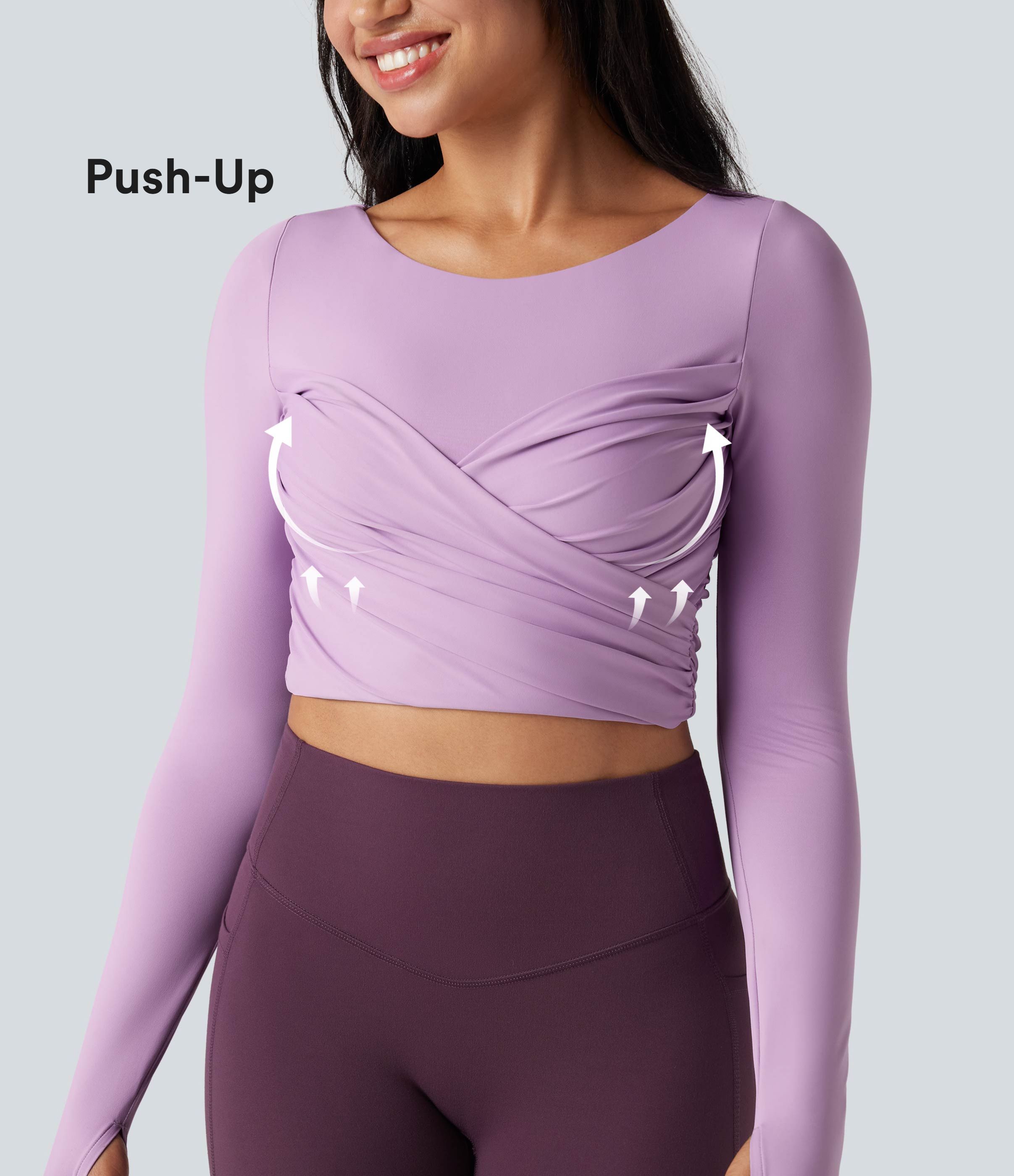 Trumpintas jogos sportinis topas su push-up efektu, formuotais spacer kaušeliais, apvalia iškirpte, ilgomis rankovėmis su nykščių angomis ir kryžminiu dizainu.