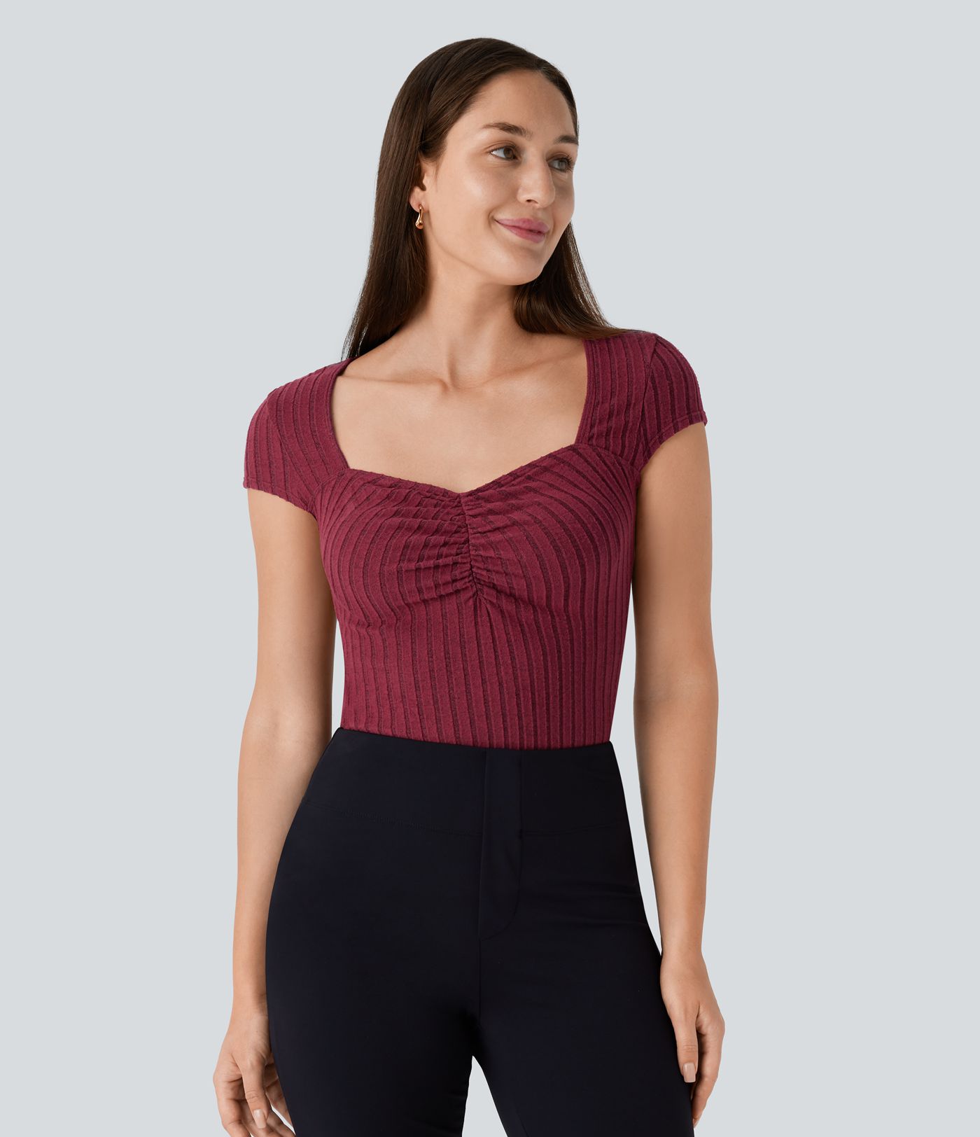 Ribbed Knit Sweetheart Neck Ruched Cap Sleeve Slim Work Top