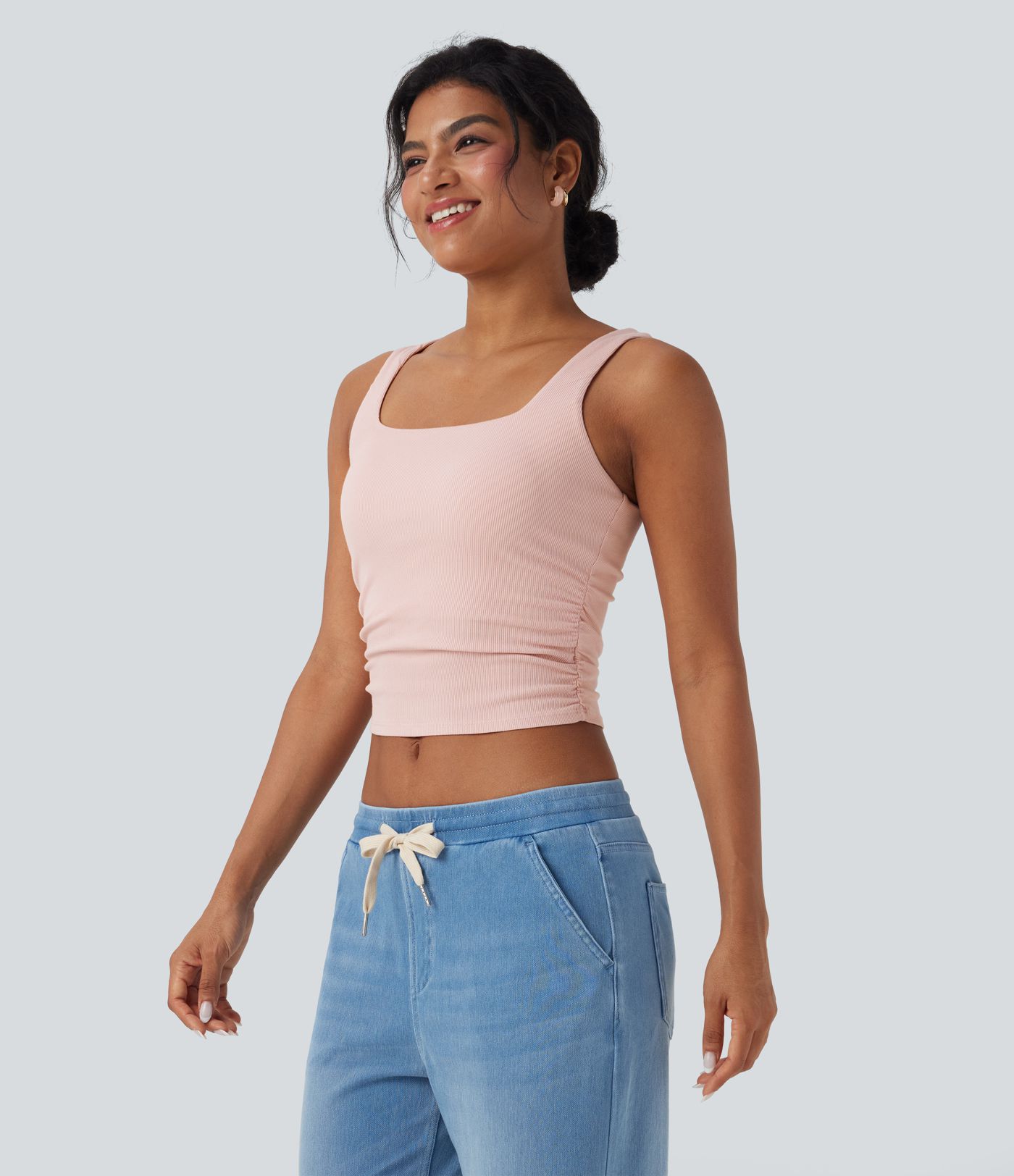 Ribbed Square Neck Ruched Cropped Casual Tank Top