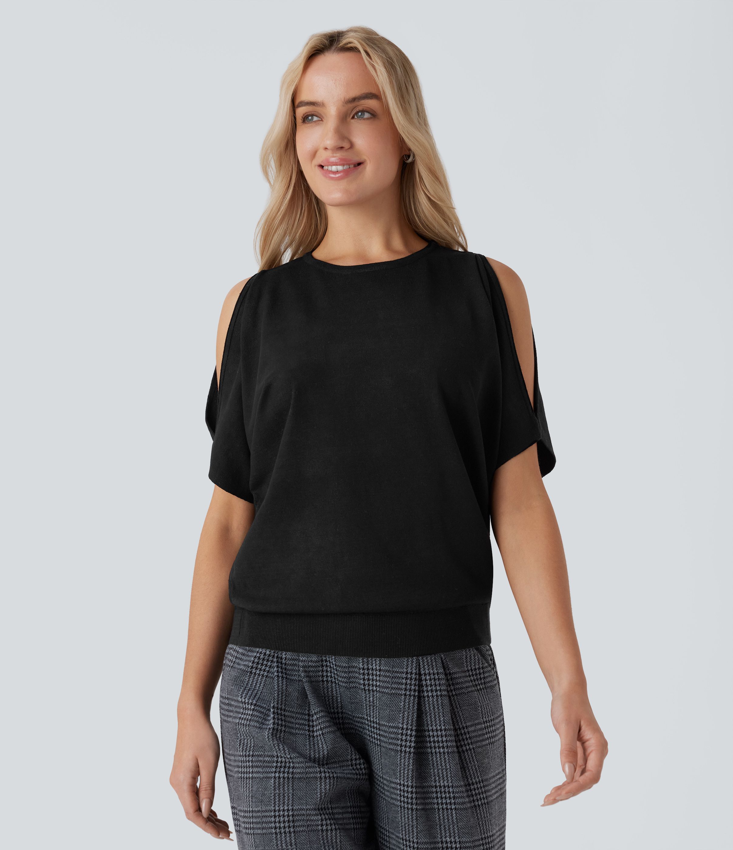 Round Neck Cold Shoulder Short Sleeve Work Sweater