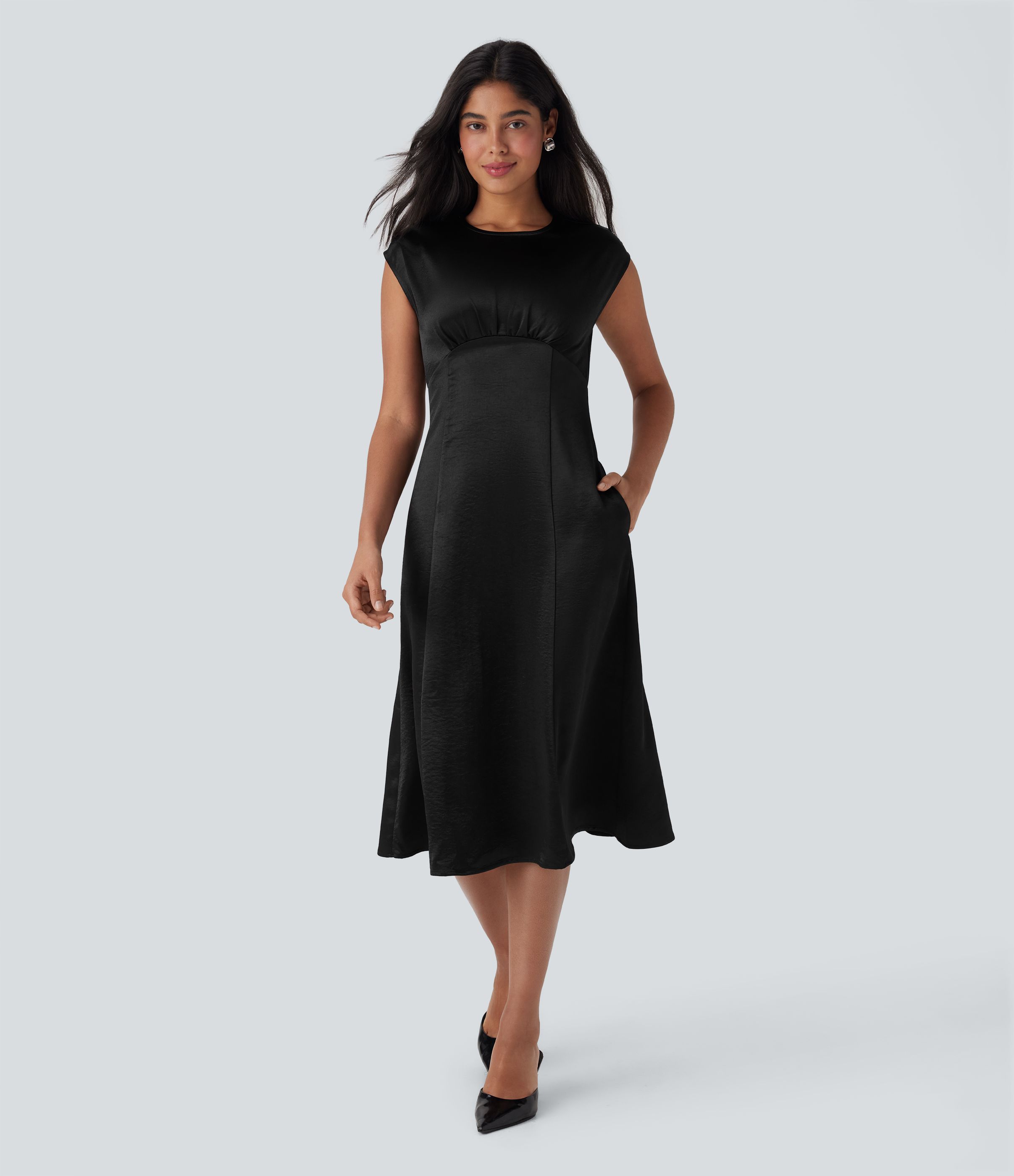 Round Neck Ruched Midi Satin Work Dress with Pockets