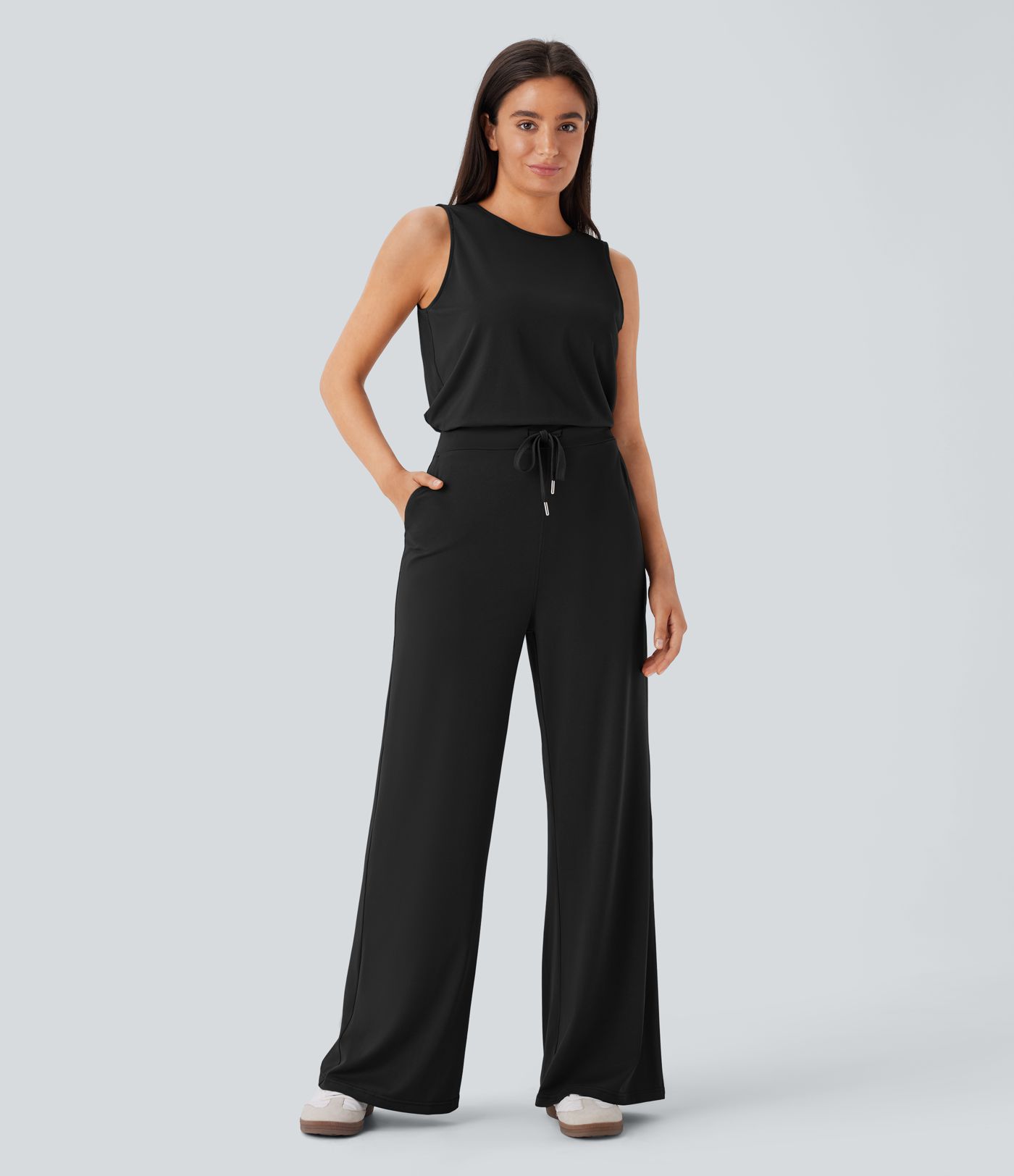 Round Neck Sleeveless Keyhole Back Drawstring Pocket Casual Jumpsuit