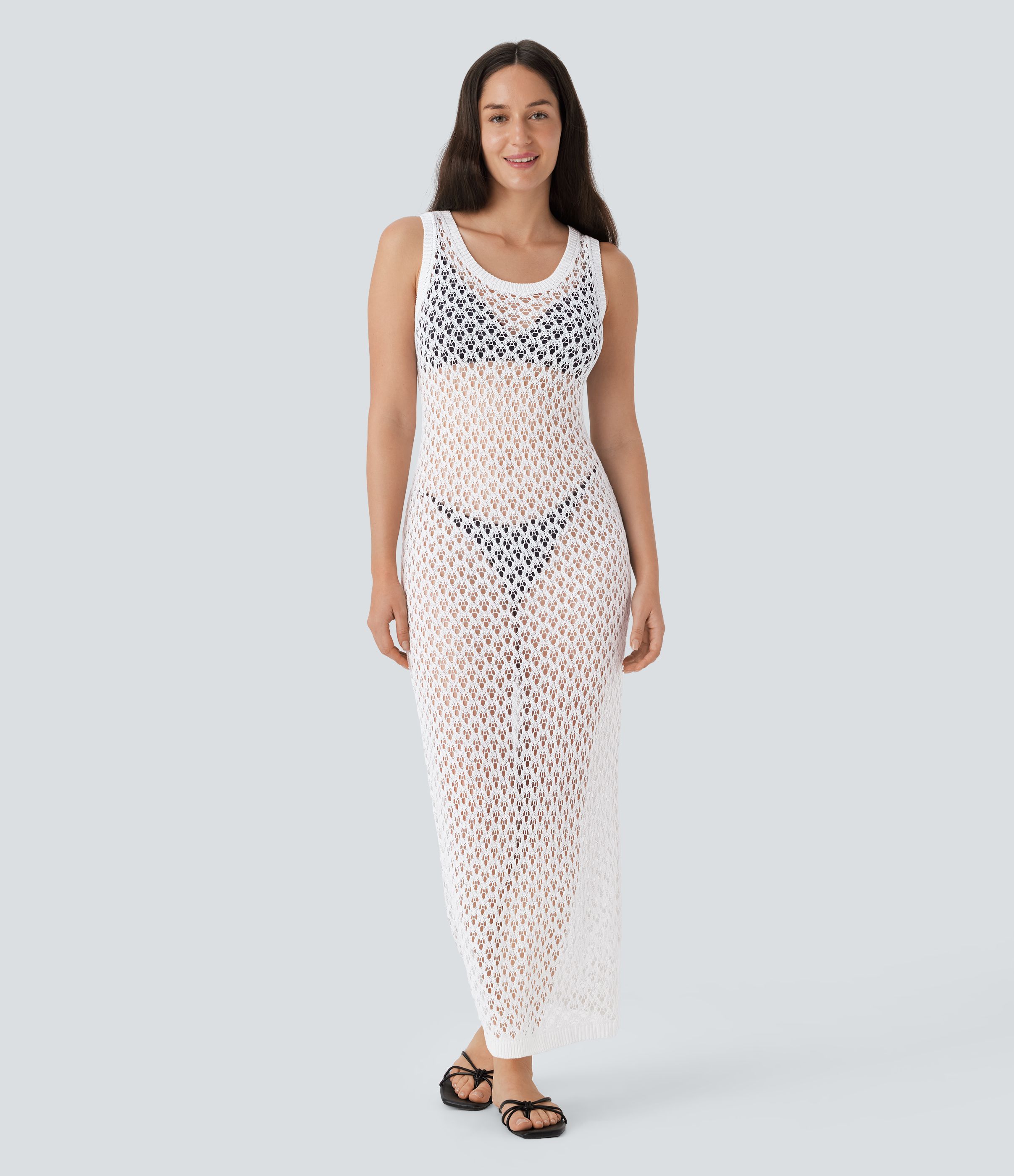 Round Neck Sleeveless Midi Hollow Out Linen-Feel Cover Up Dress