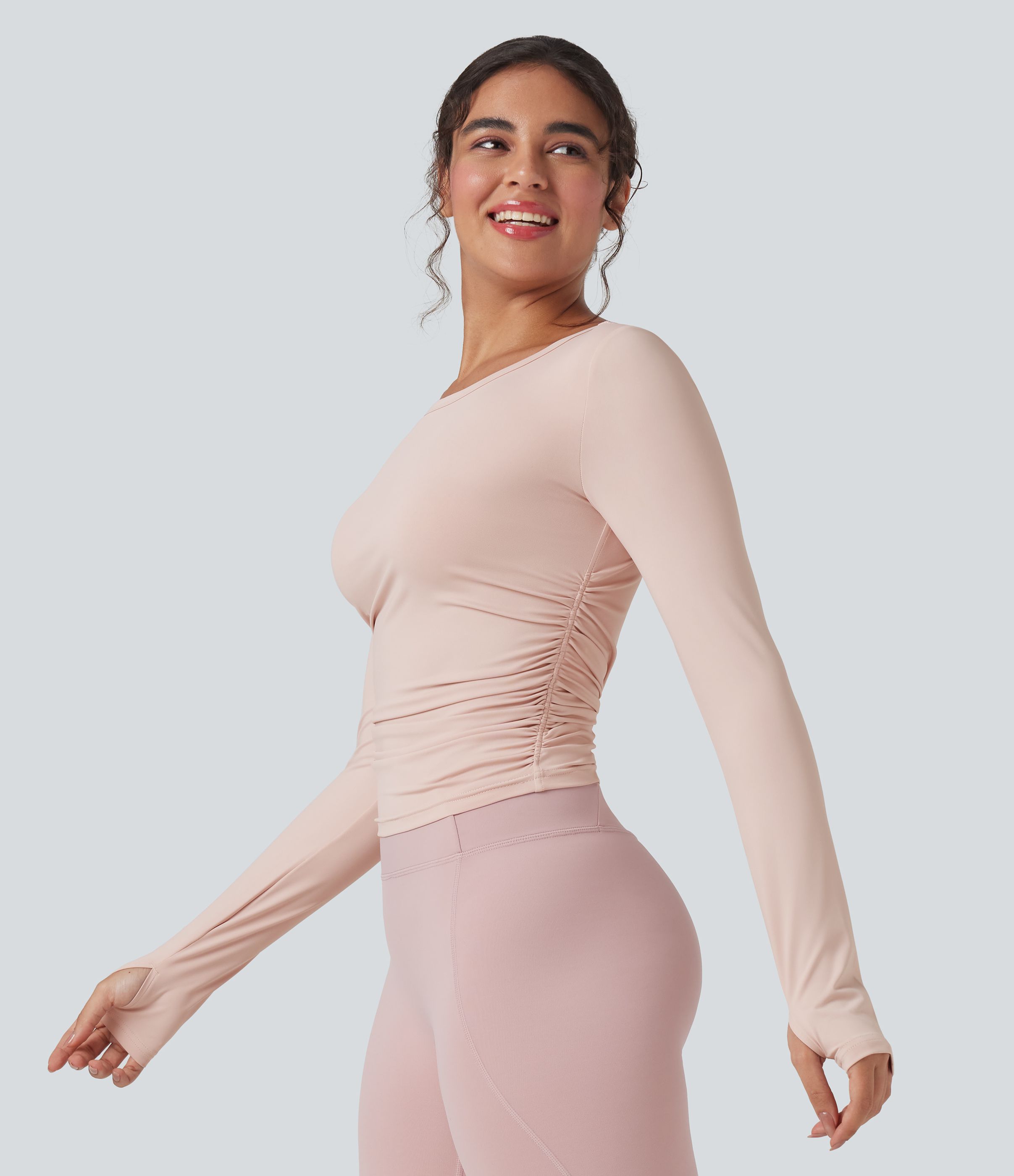 Round Neck Long Sleeve Thumb Holes Ruched Yoga Sports Top