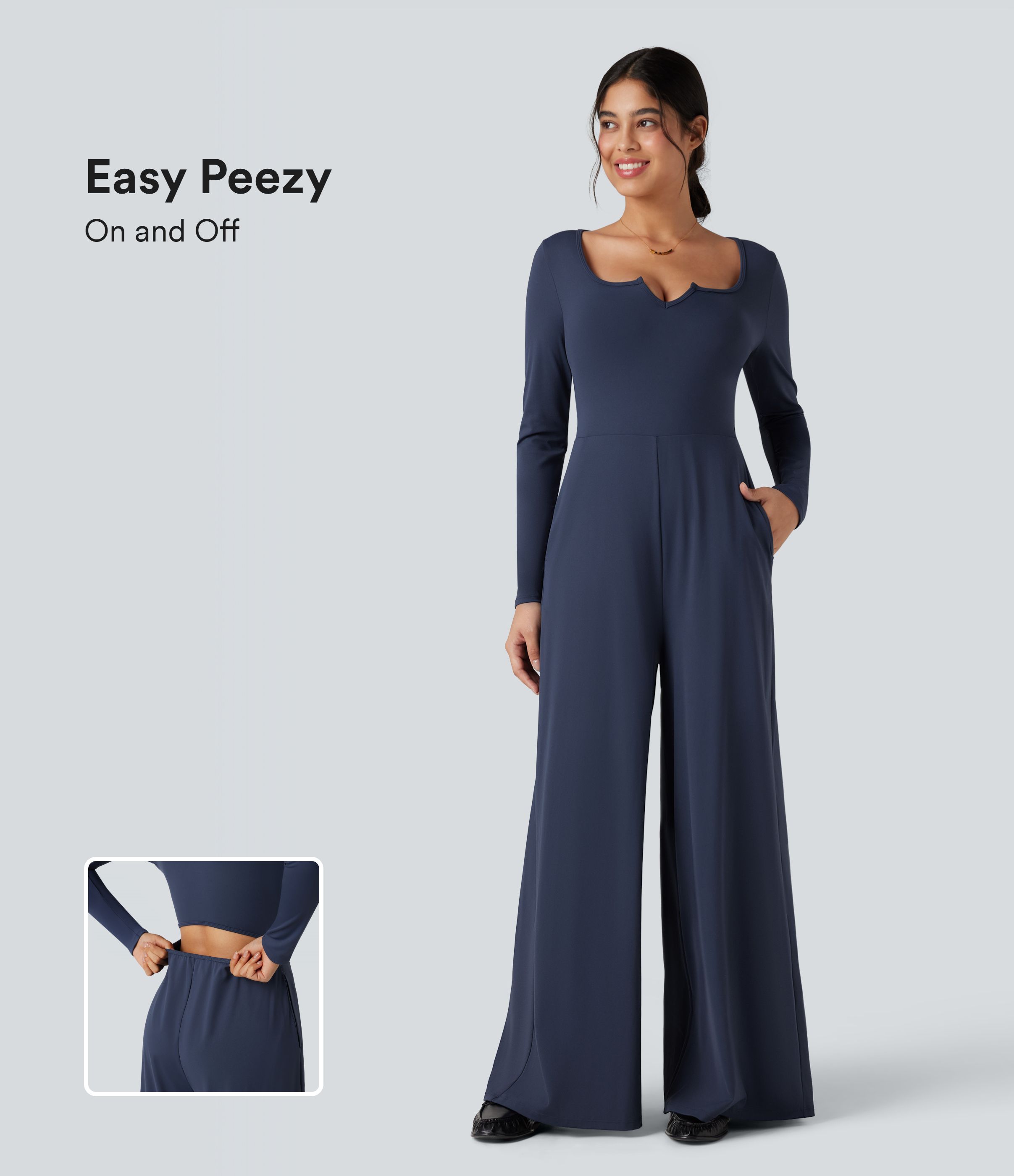 SoftlyZero™ Airy Notched Long Sleeve Cut Out Cool Touch Work Jumpsuit with Pockets-Easy Peezy Edition