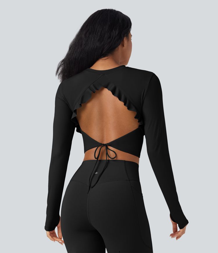SoftlyZero™ Airy Round Neck Long Sleeve Thumb Hole Cut Out Tie Back Cool Touch Cropped Yoga Sports Top