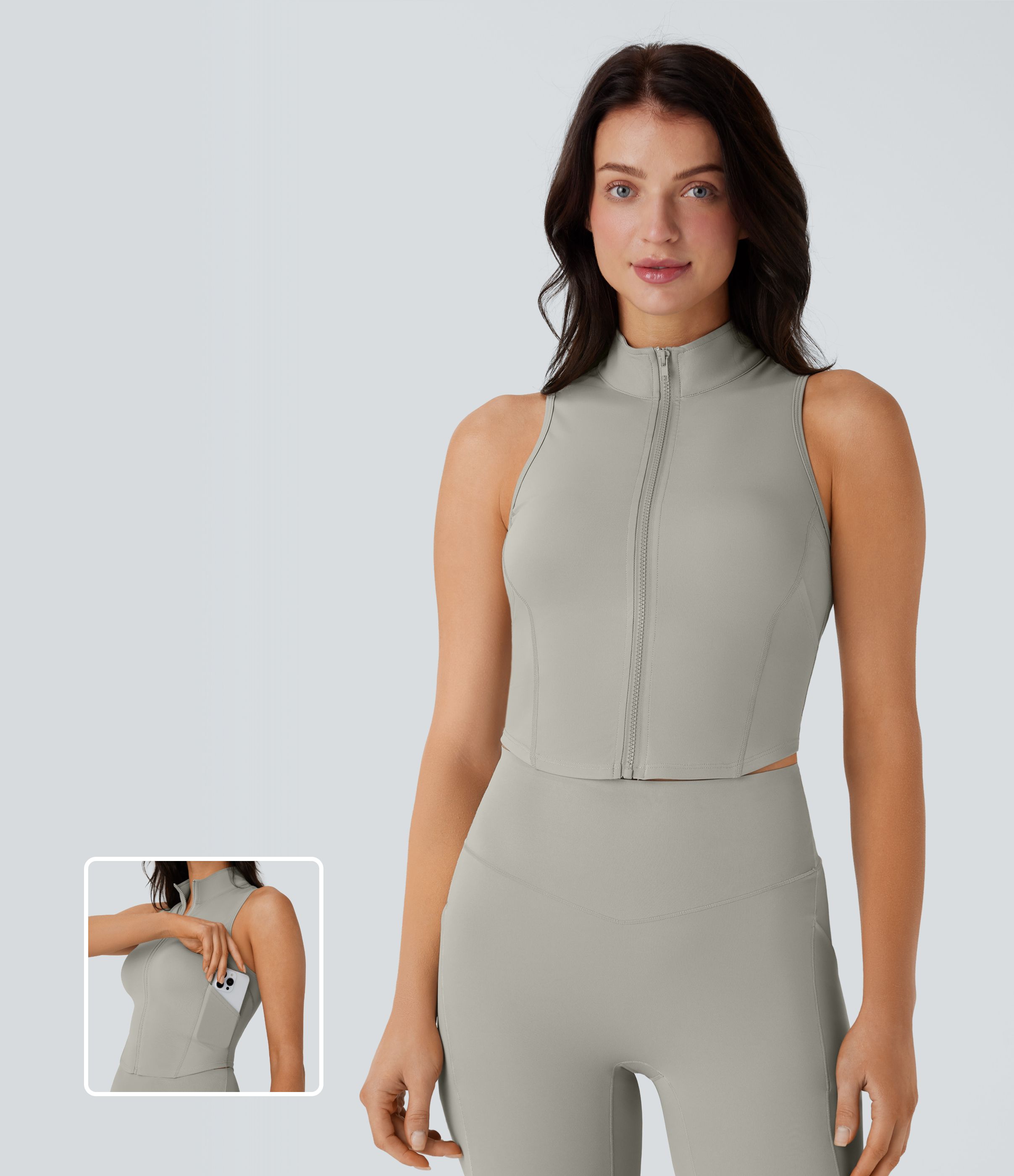 SoftlyZero™ QuickDry Stand Collar Zipper Cropped Yoga Tank Top with Pockets