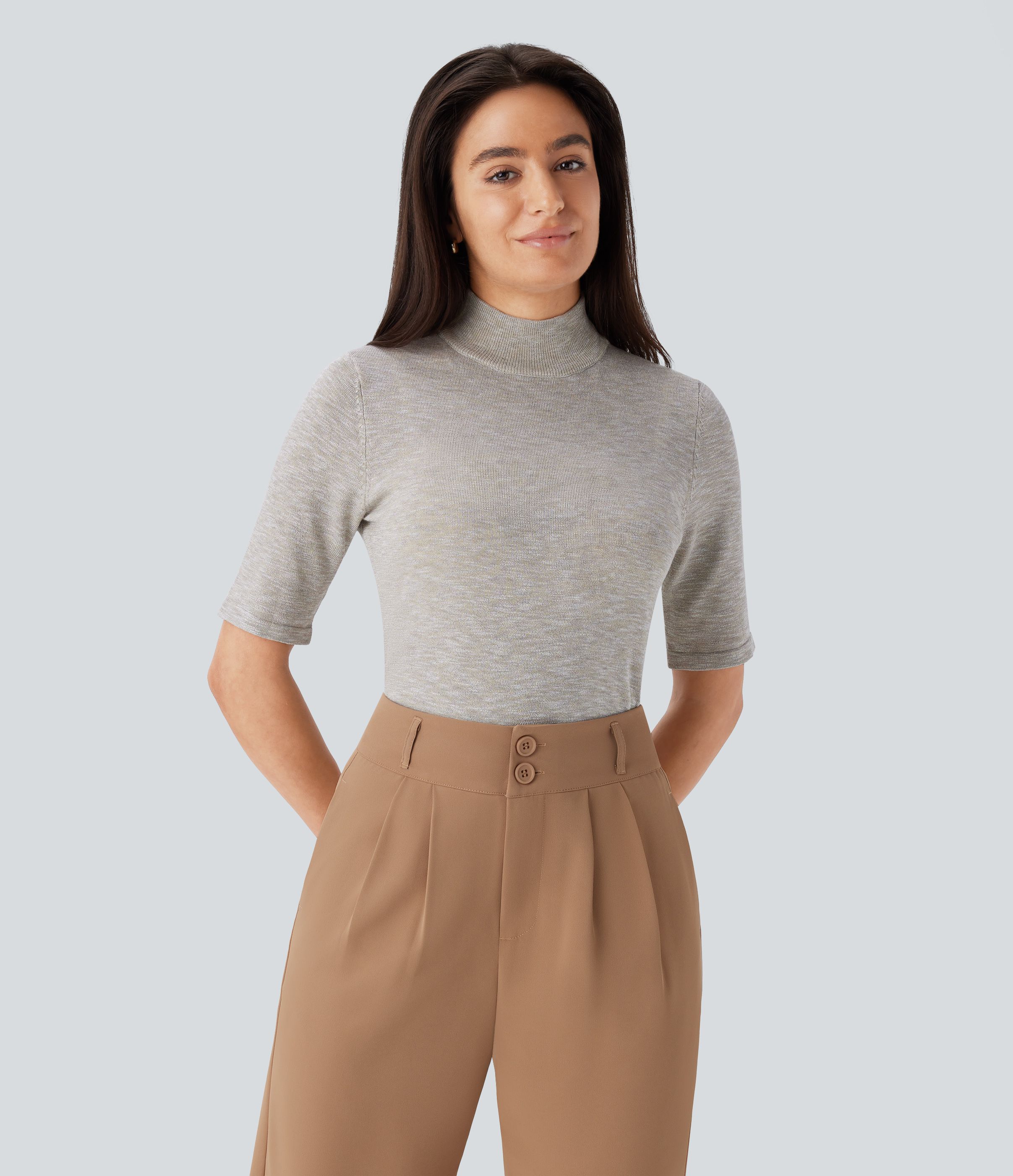 Stand Collar Elbow Sleeve Slim Work Linen-Feel Sweater