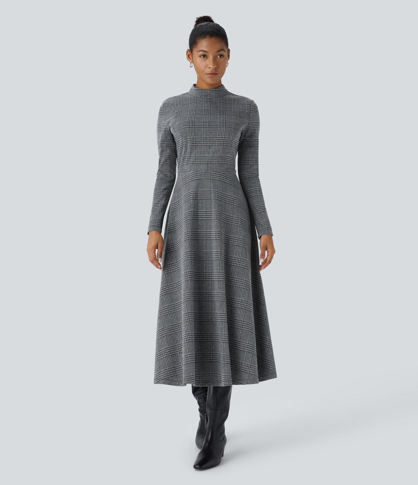 Stand Collar Zipper Long Sleeve Flare Midi Houndstooth Plaid Work Dress