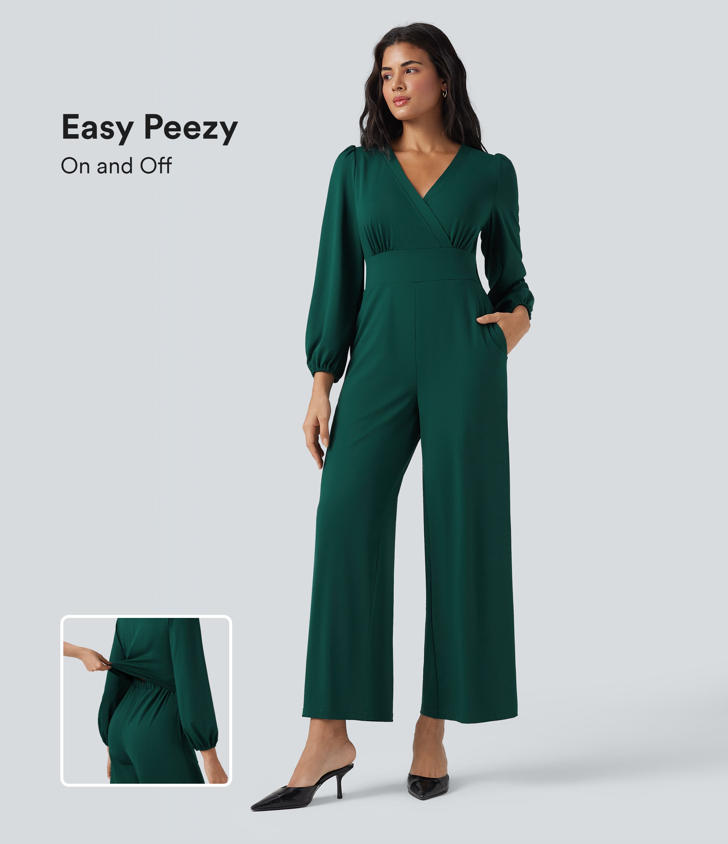 V Neck Long Sleeve Wide Leg Work Jumpsuit with Pockets-Easy Peezy Edition
