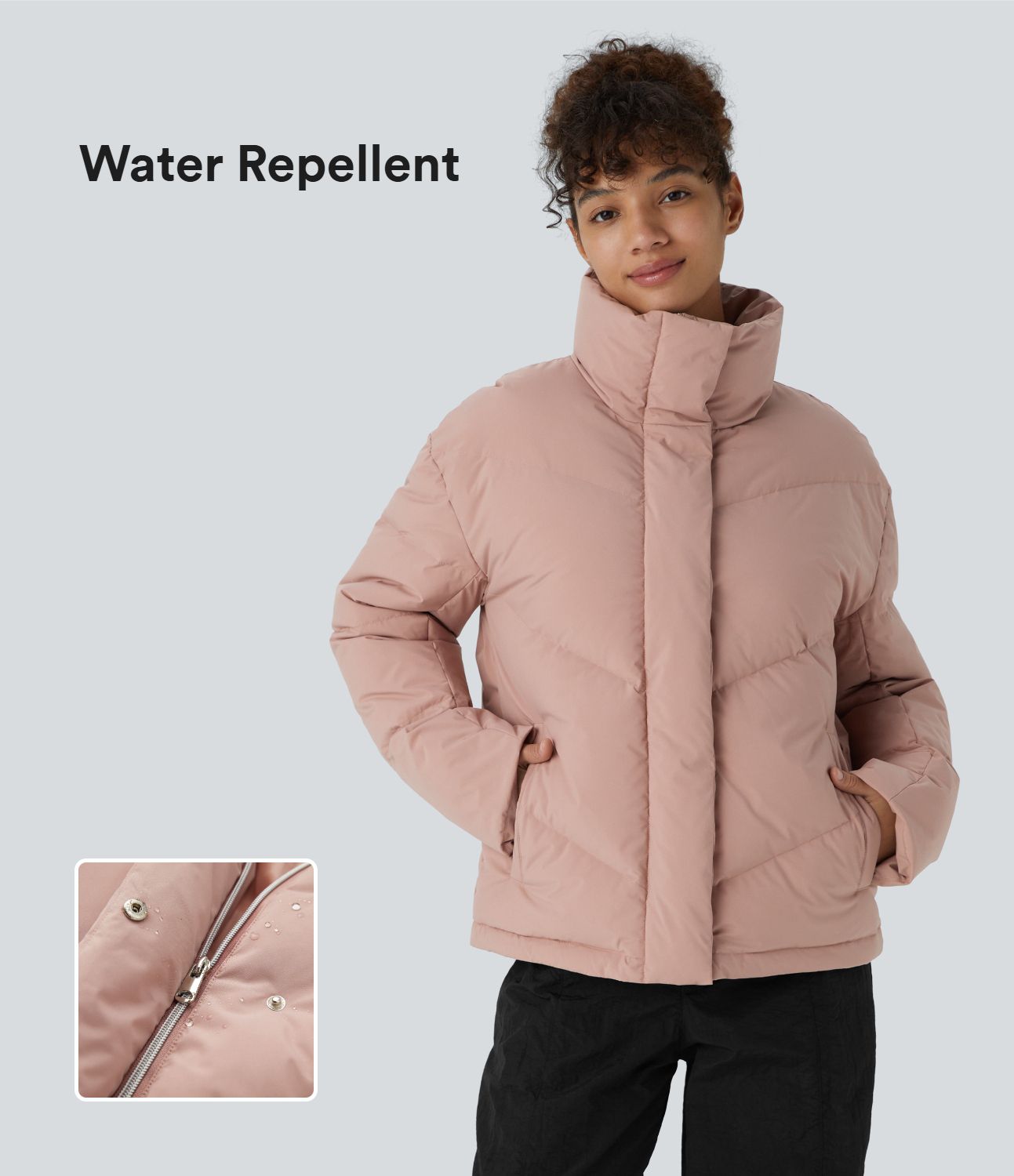 Water Repellent Funnel Neck Pocket Snap Zipper Drawstring Hem Relaxed Casual Puffer Down Jacket