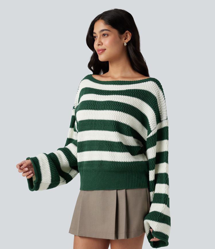 Boat Neck Long Sleeve Striped Relaxed Casual Sweater
