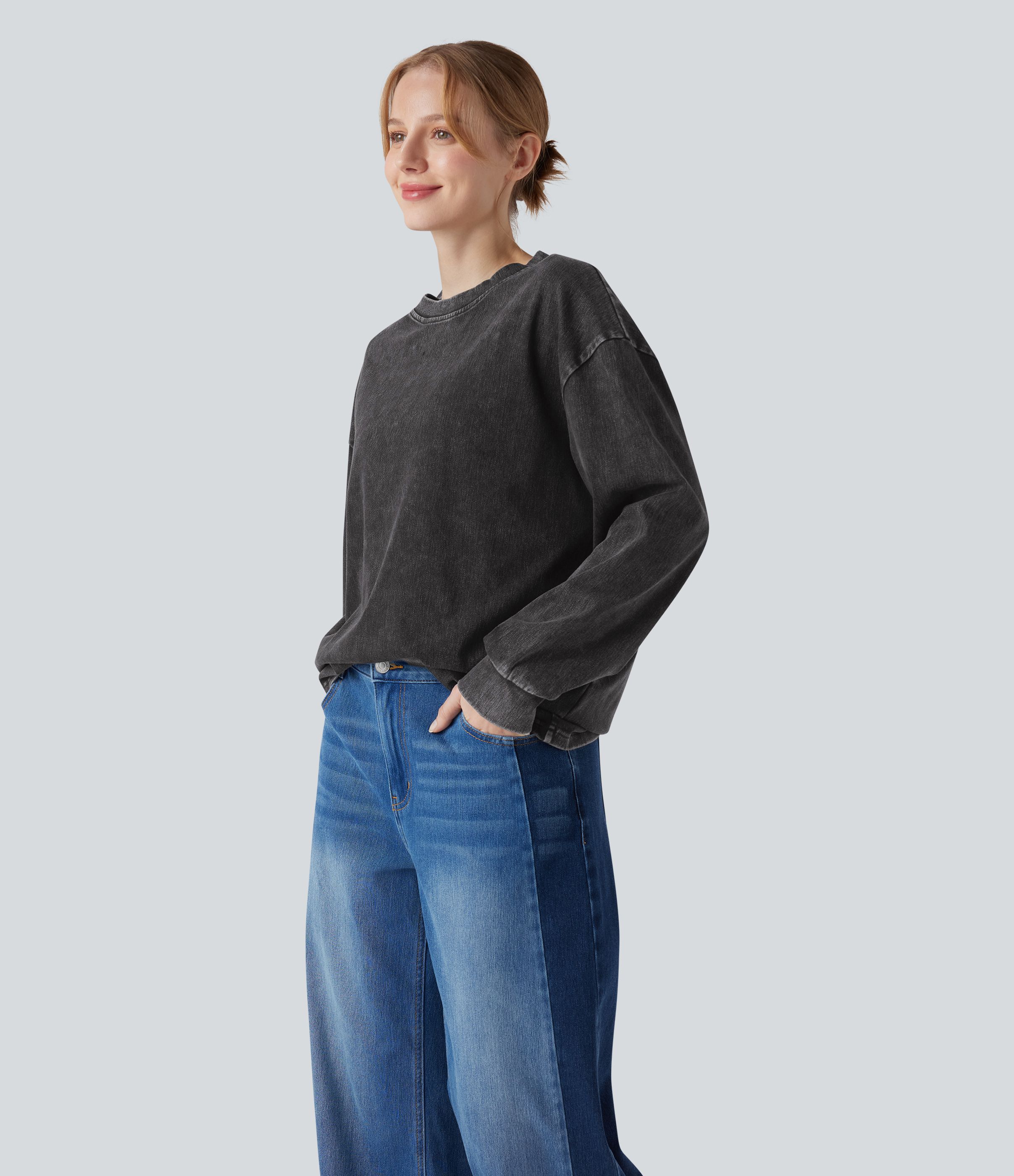 Halara Flex™ Denim Round Neck Long Sleeve Washed Casual T-Shirt