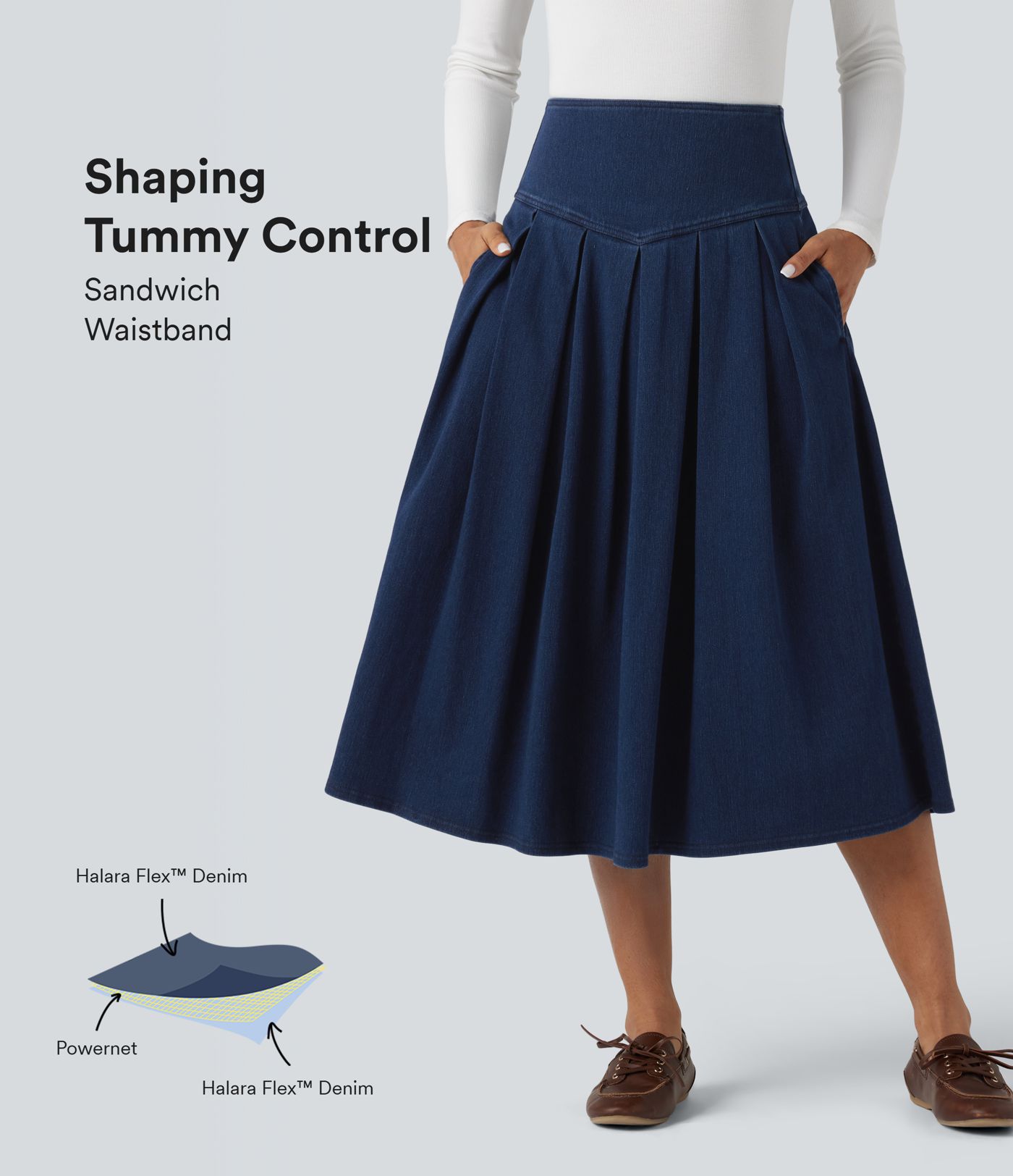 Halara Flex™ High Waisted Tummy Control Pleated Midi Casual Denim Skirt with Pockets