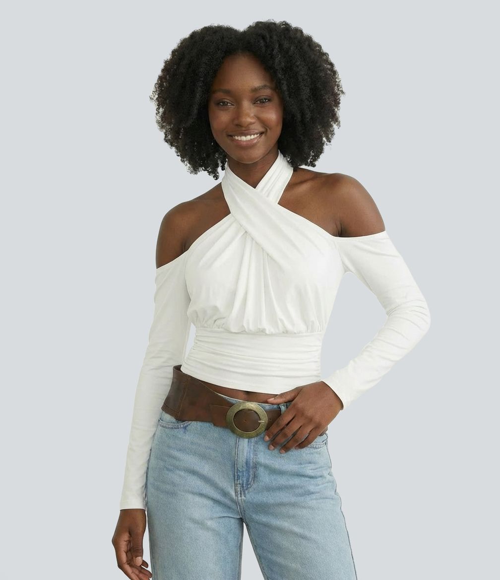 Halter-Oberteil, rückenfrei, langärmelig, lässig