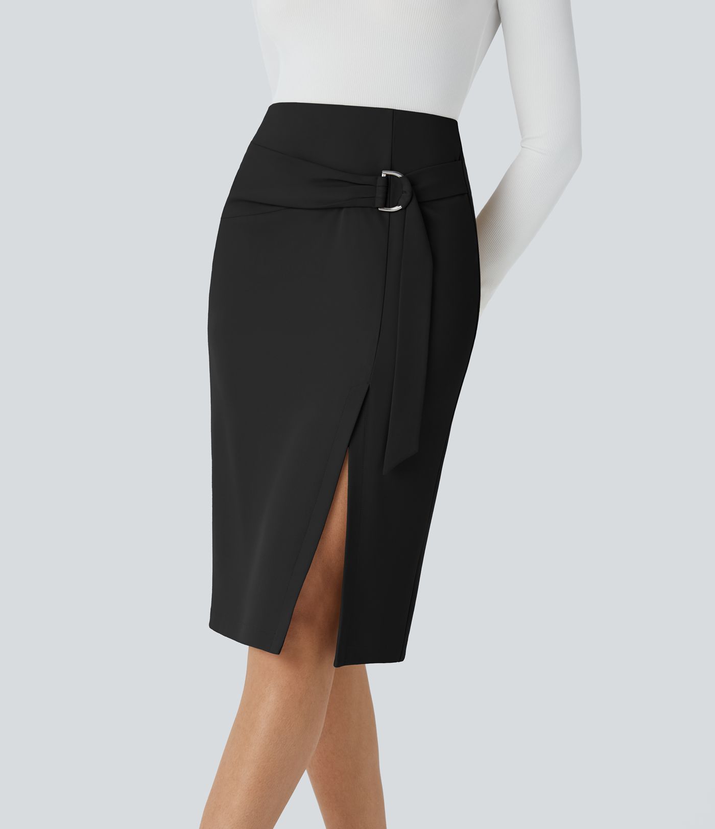 High Waisted Belted Pocket Midi Work Pencil Skirt