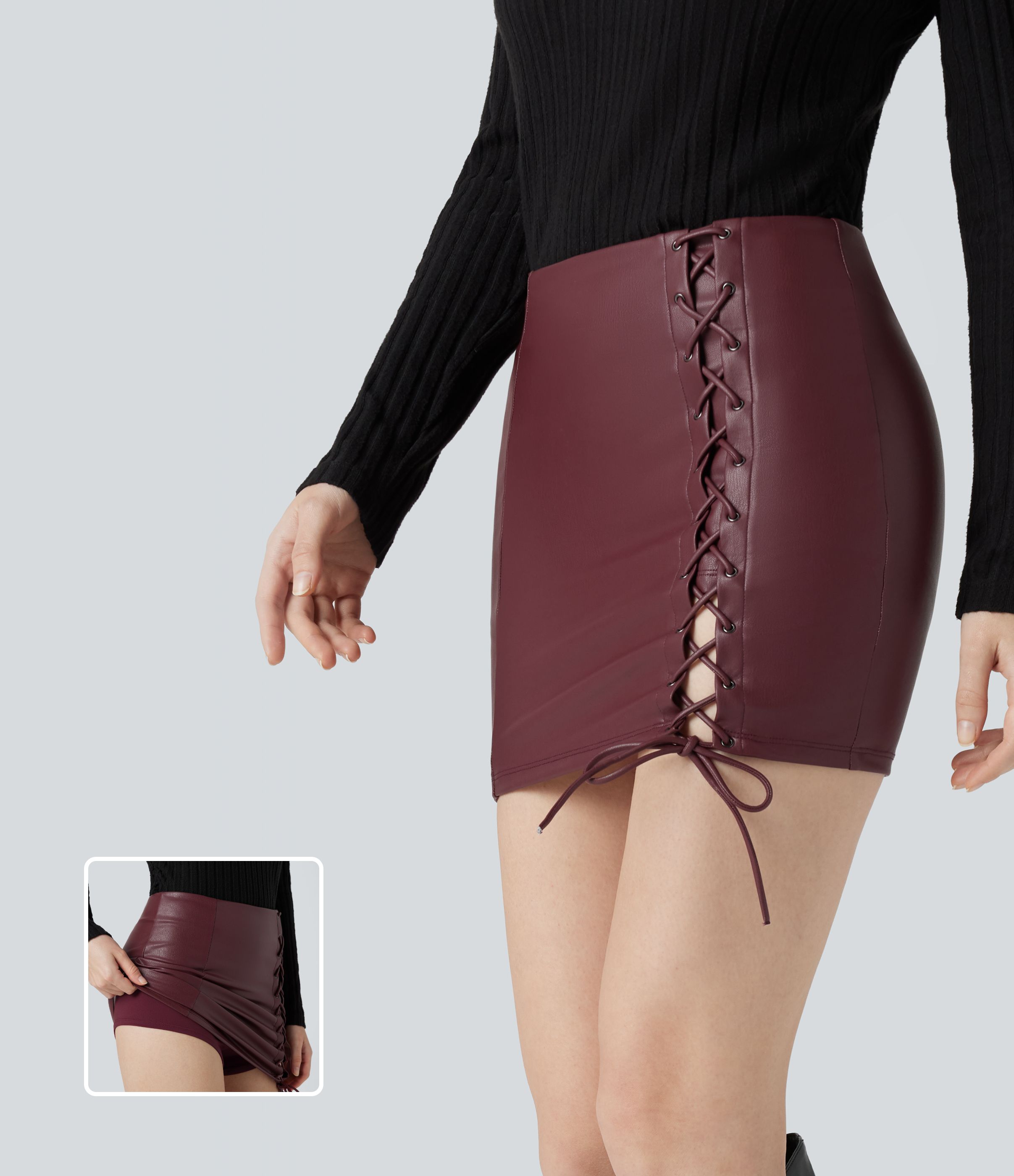 High Waisted Lace Up Bodycon 2-in-1 Fleece Mini PU Leather Skirt
