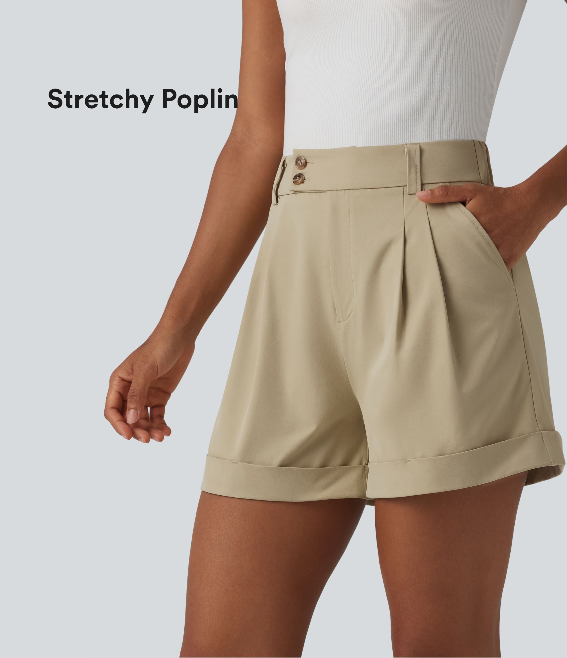 High Waisted Pleated Rolled Hem Stretchy Poplin Work Baggy Shorts with Pockets
