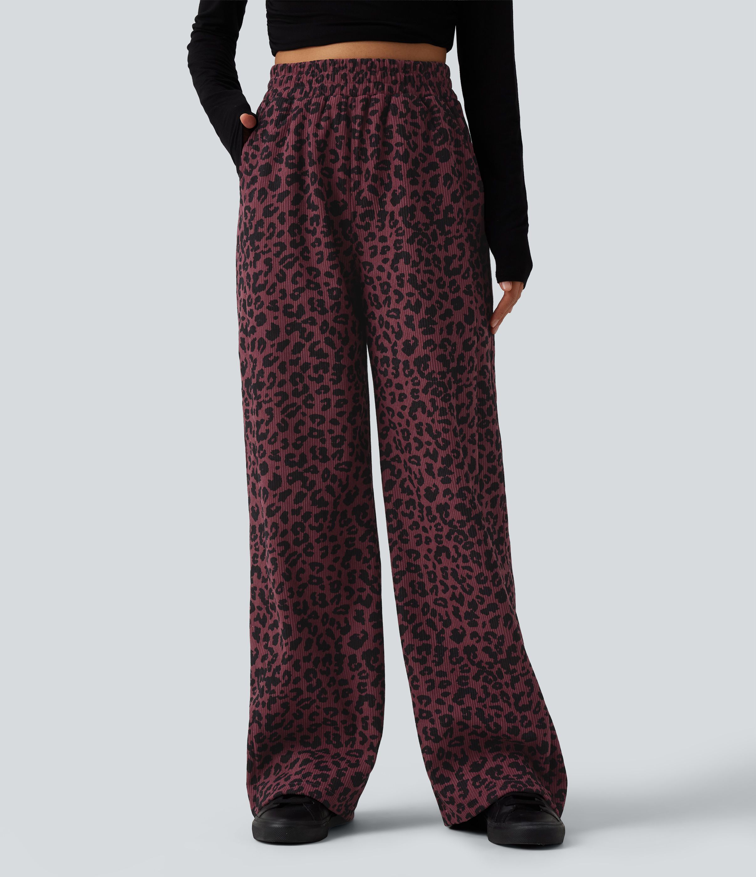 Pantalon décontracté taille haute en velours imprimé léopard, coupe droite style 'mop', avec poches