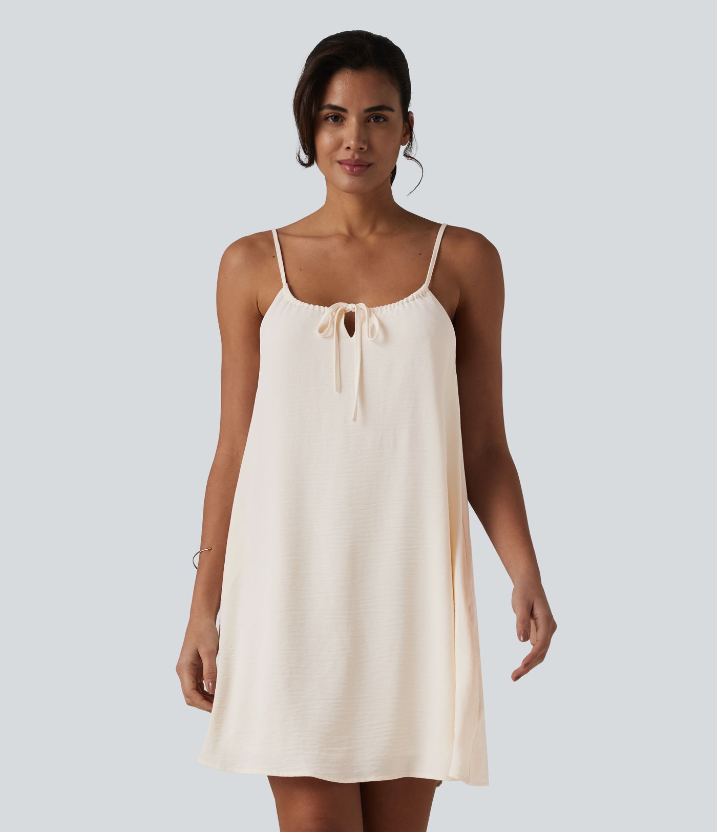 Lace Up Mini Linen-Feel Slip Dress with Pockets