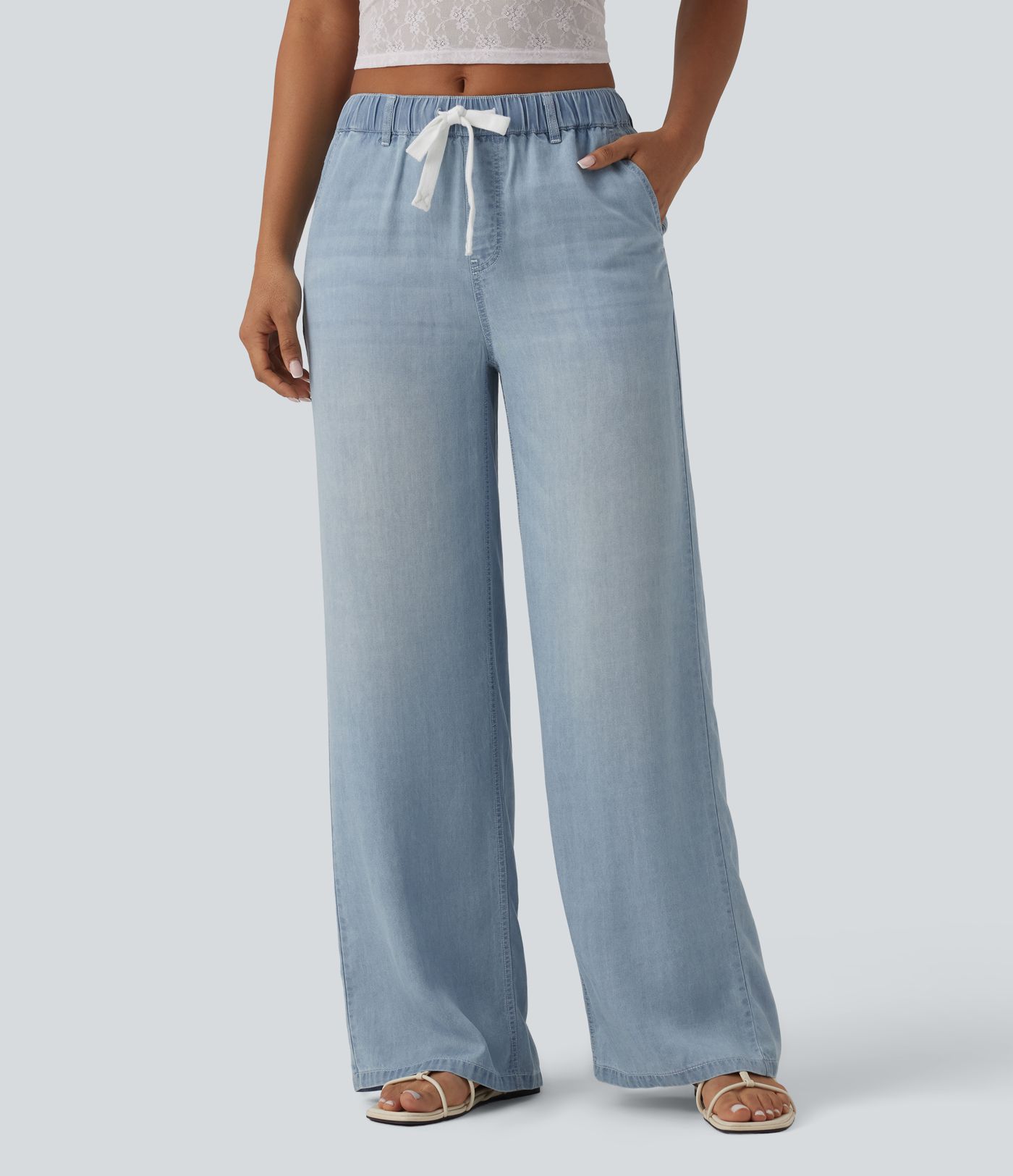 Mid Rise Drawstring Casual Jeans with Pockets