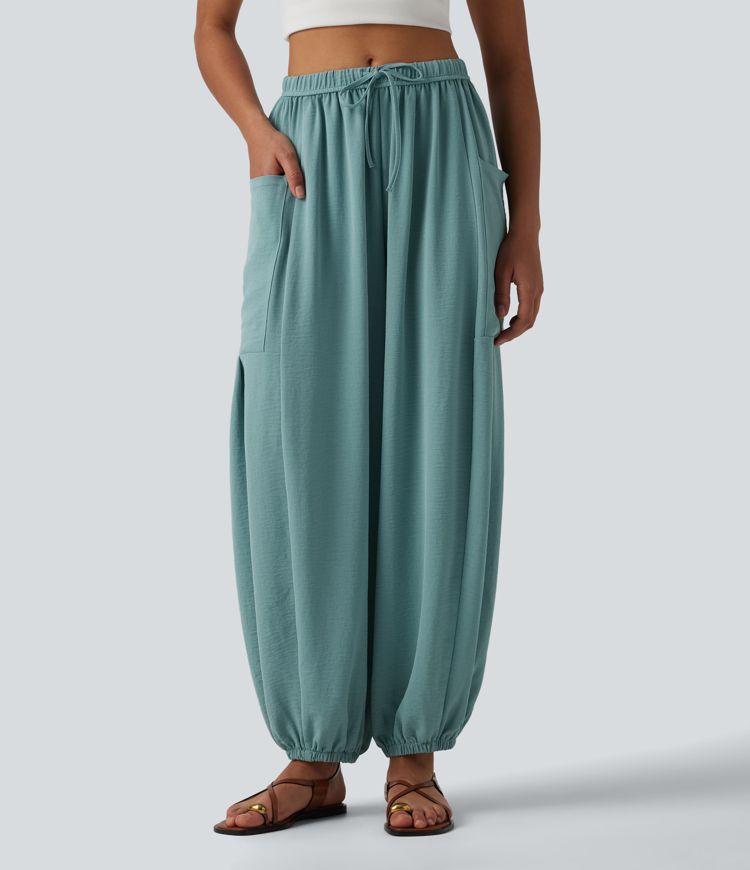 Mid Rise Drawstring Linen-Feel Joggers with Pockets