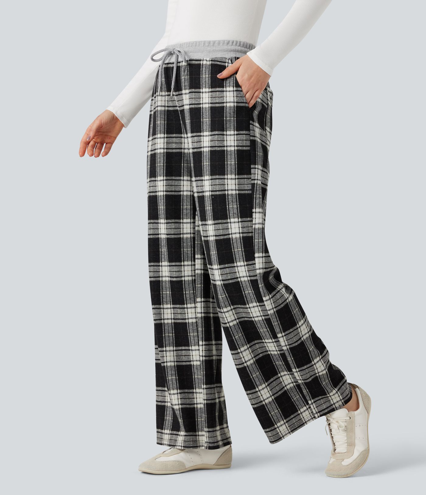 Halara Flex™ Mid Rise Drawstring Wide Leg Plaid Work Pants with Pockets