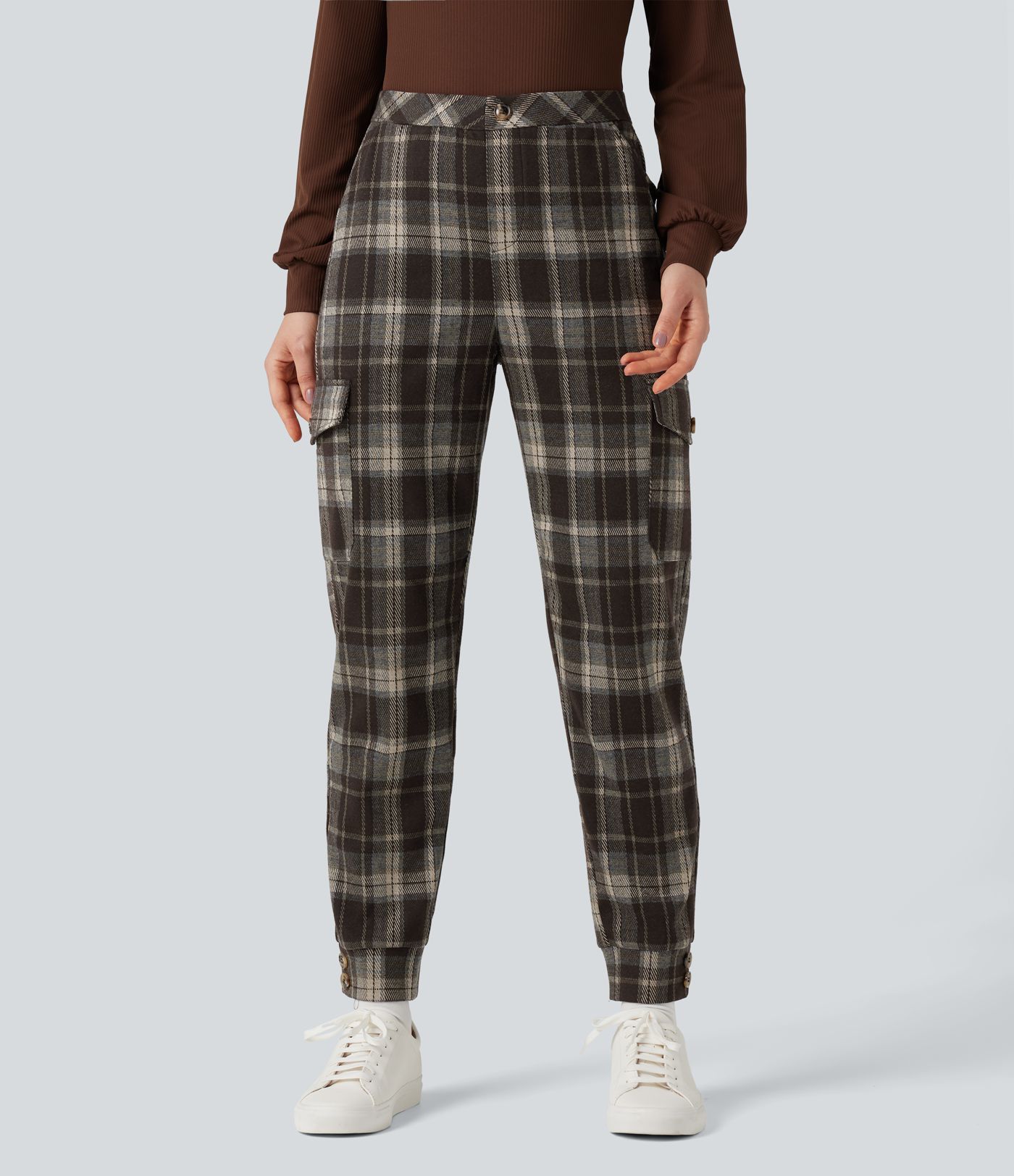 Mid Rise Plaid Work Cargo Joggers with Pockets
